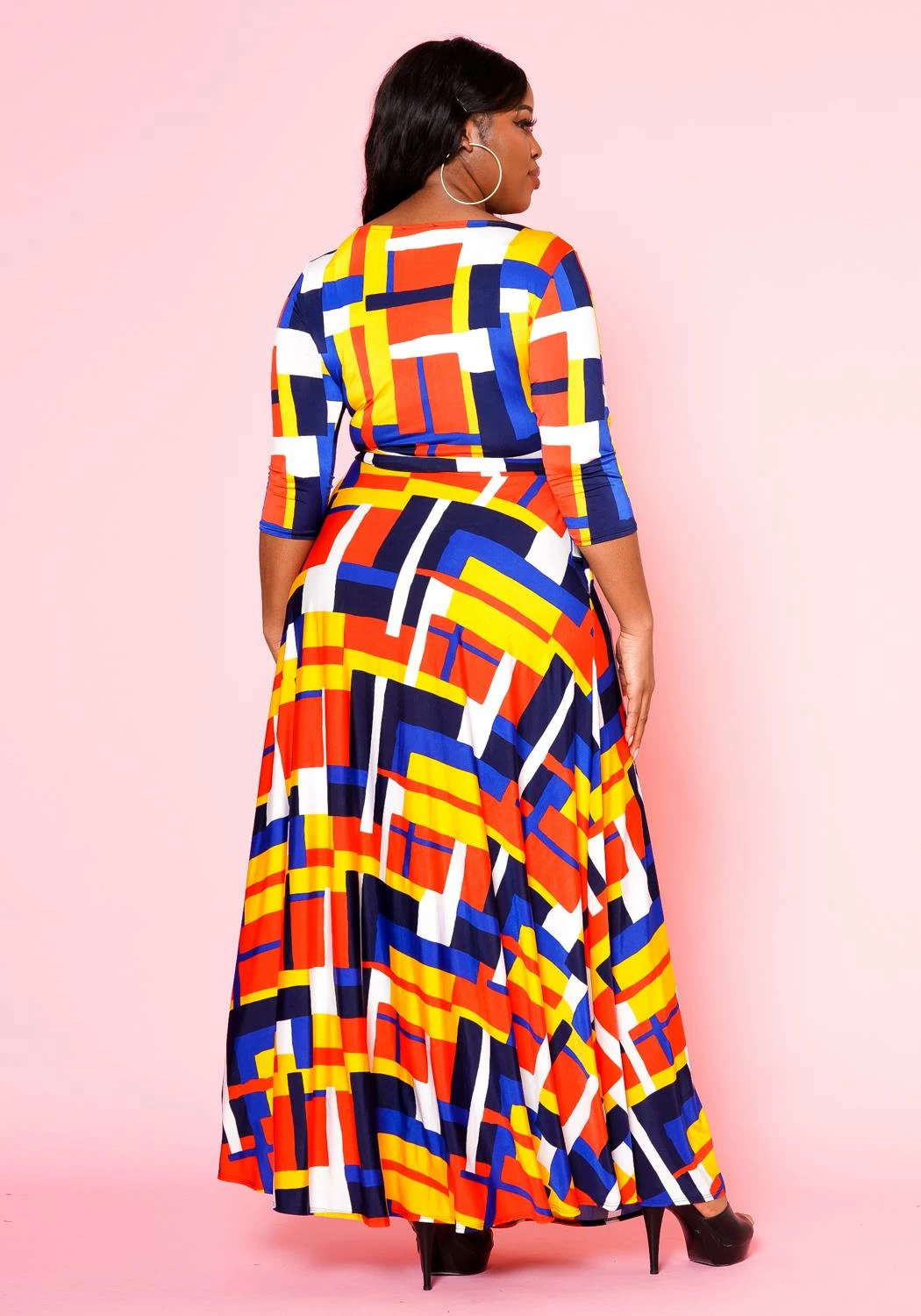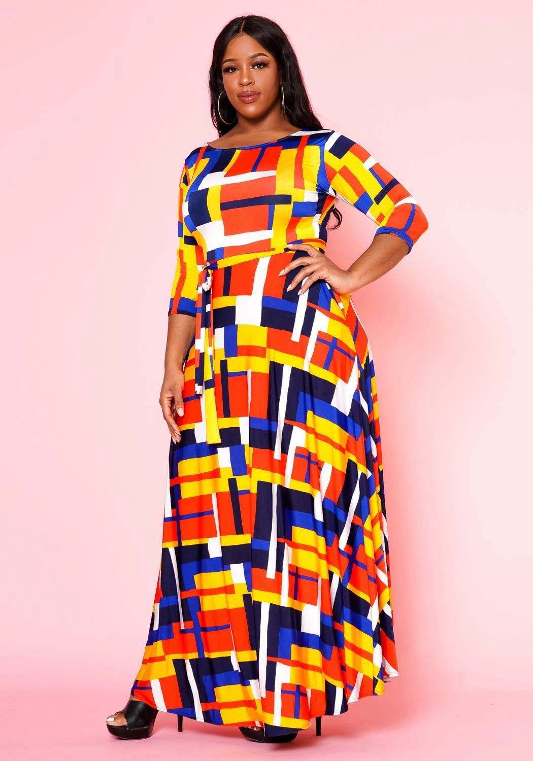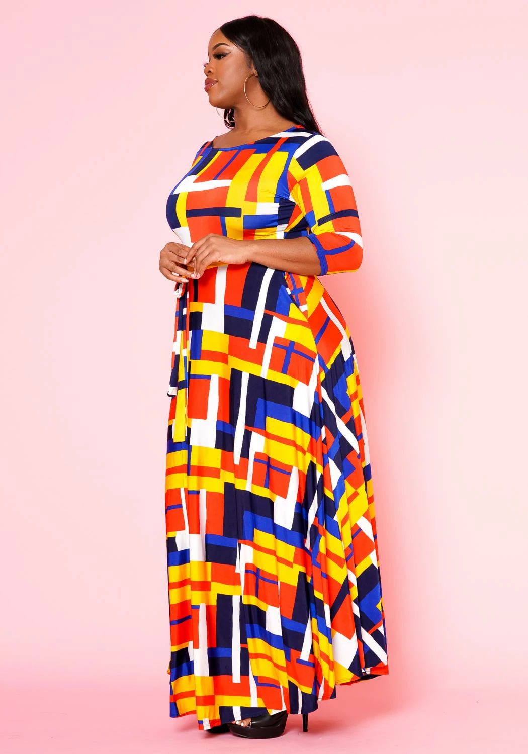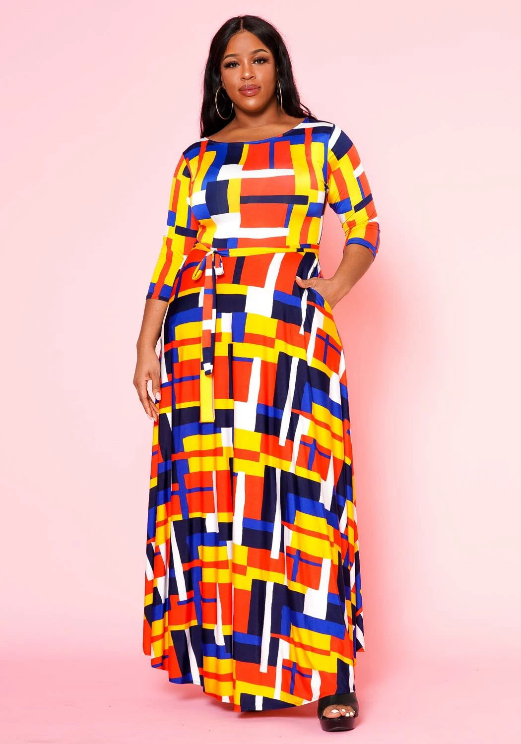 Lovely plus size women’s fit to flare maxi dress with geometric pattern, 3/4 fitted long sleeves, pocket hem and waist tie ascent.