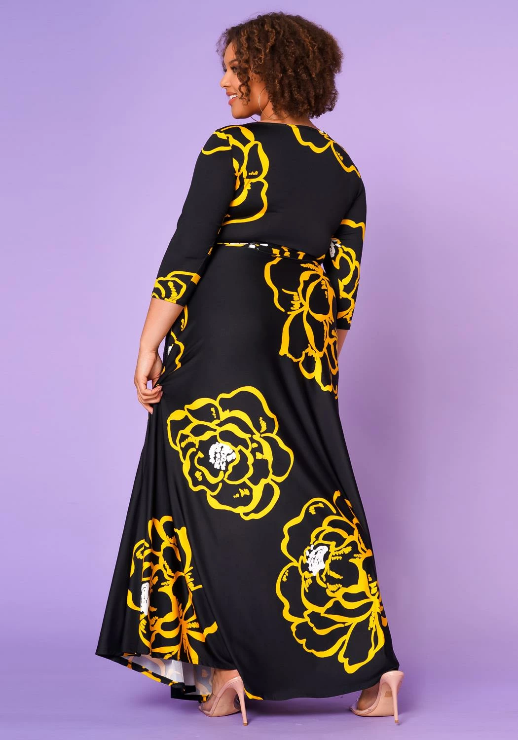 Beautiful plus size women’s bold golden floral print maxi dress in fit to flare style, 3/4 sleeves, round neckline, waist tie ascent and pocket hem.