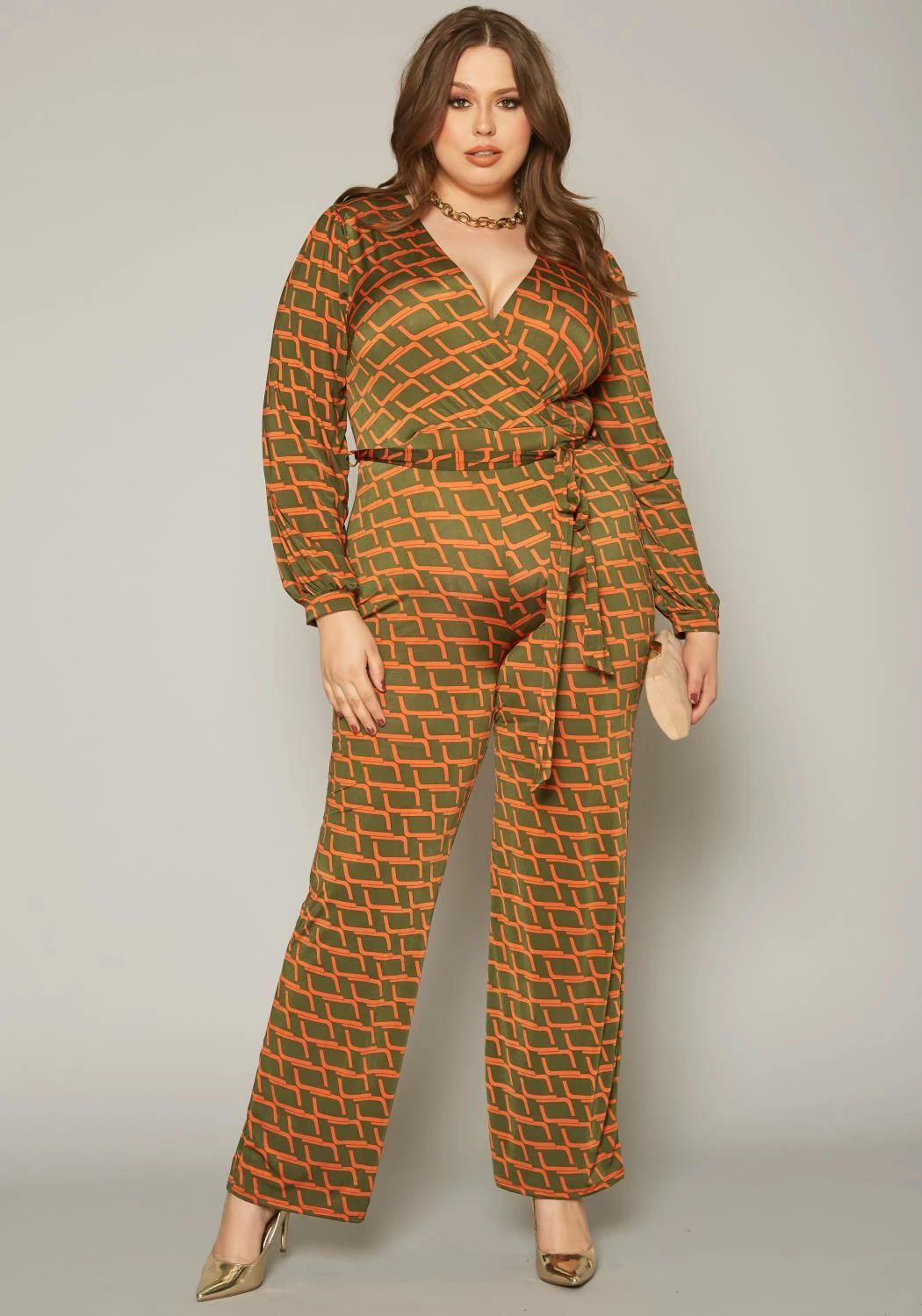 Plus size women’s jumpsuit in grid plaid pattern, v-neck style, long sleeves, waist tie ascent and flare leg hem.