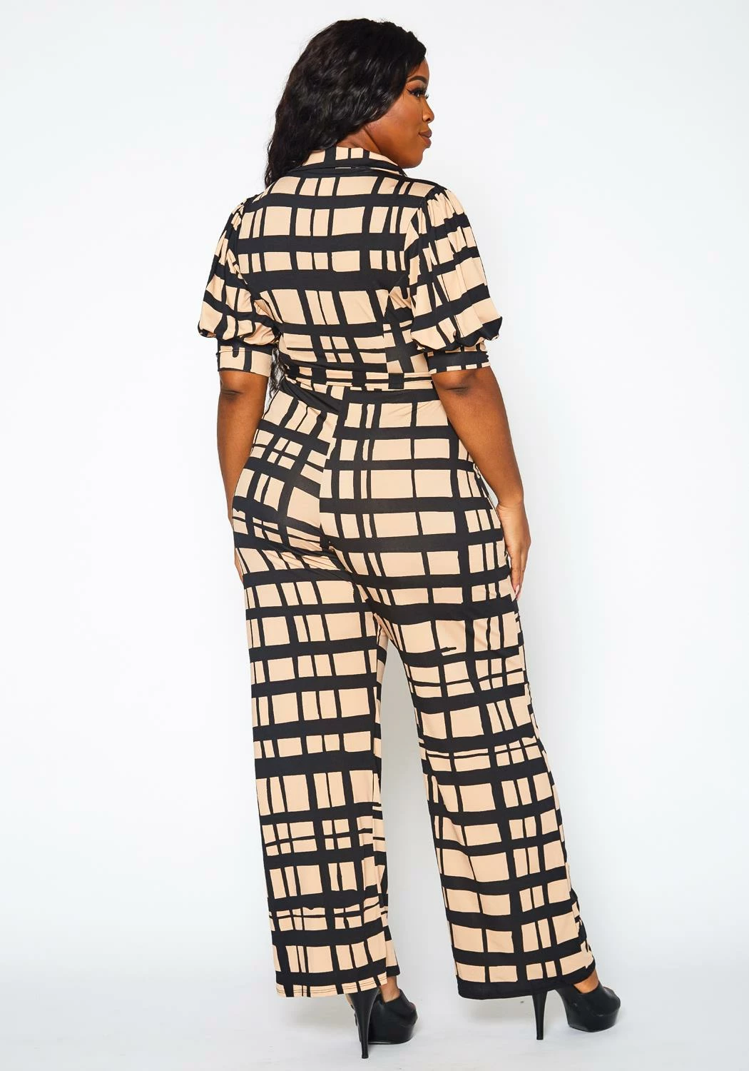 Chic plus size women’s jumpsuit in gridline plaid pattern, v-neck style, short puffy sleeves, waist tie ascent and flare leg hem.
