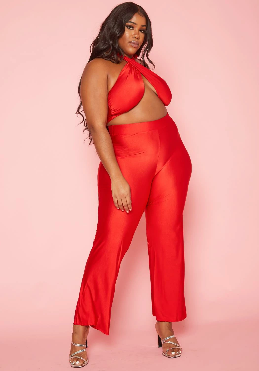 Flirty plus size women’s jumpsuit in halter neck design, cut-out hem, flare leg style and slinky material.