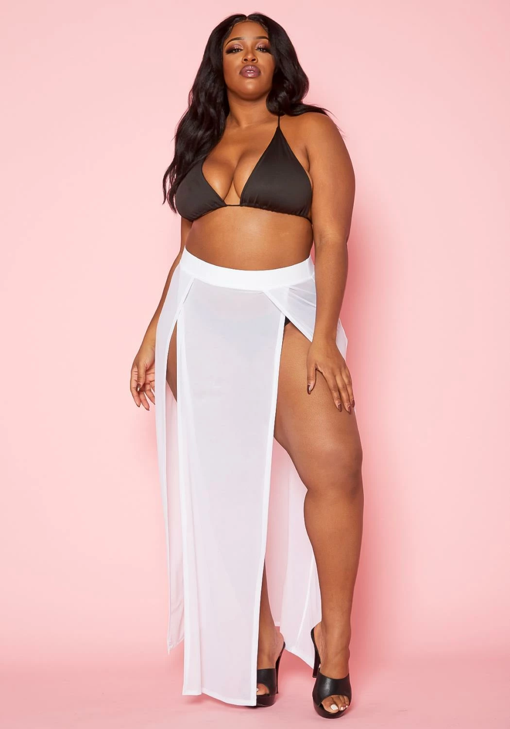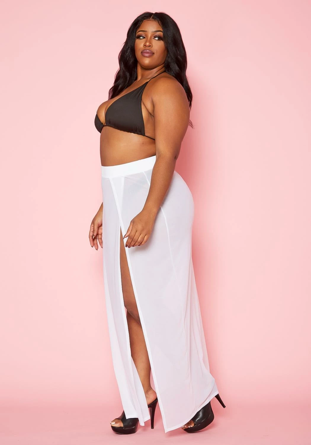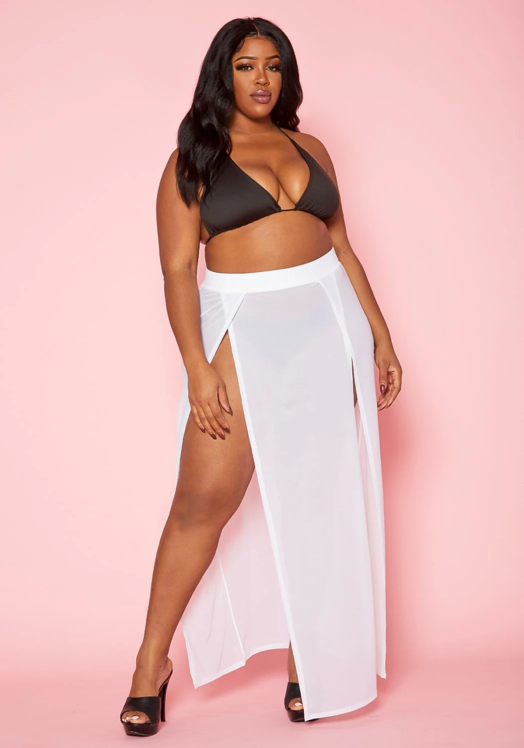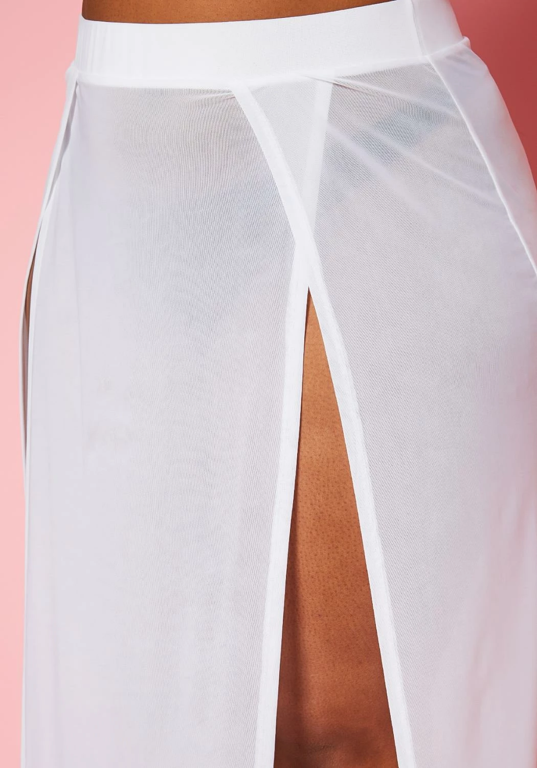 Must have swimsuit cover up skirt in all mesh material, high waist fitting and double slit hem design.