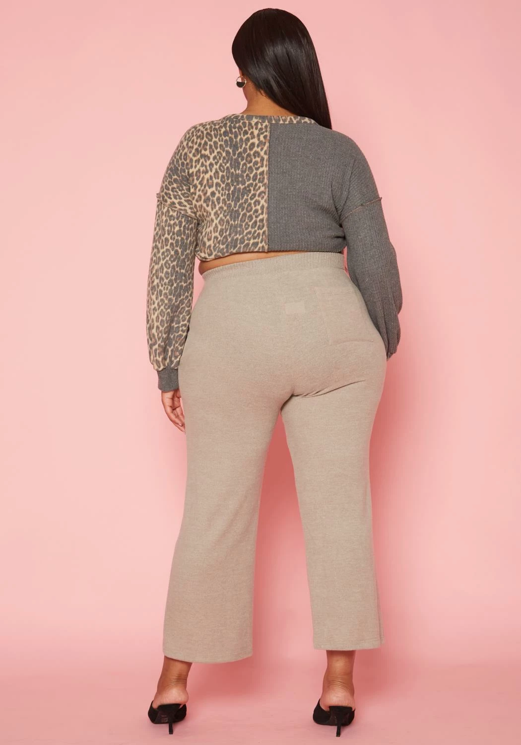 Comfy plus size women’s lounge pants in thick knit material, high waist style and pocket hem.