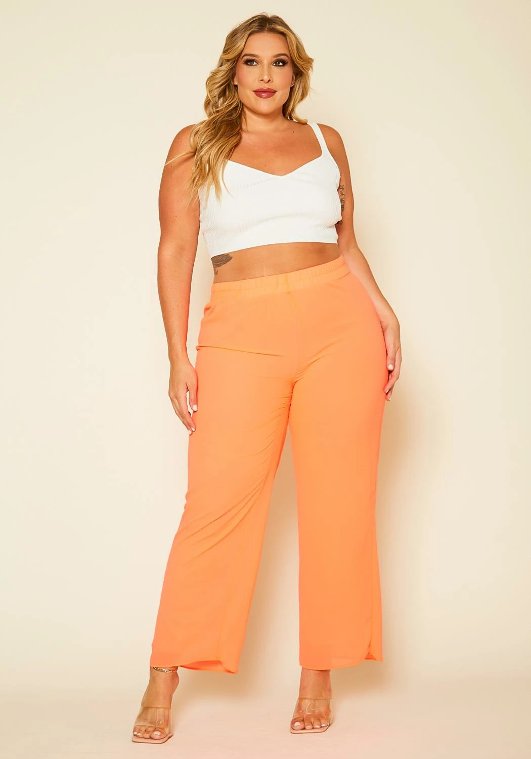 Chic plus size women’s palazzo pants in high waist style & wide flare leg hem.