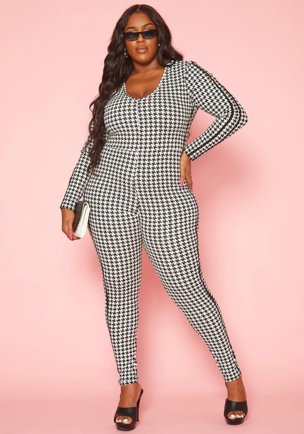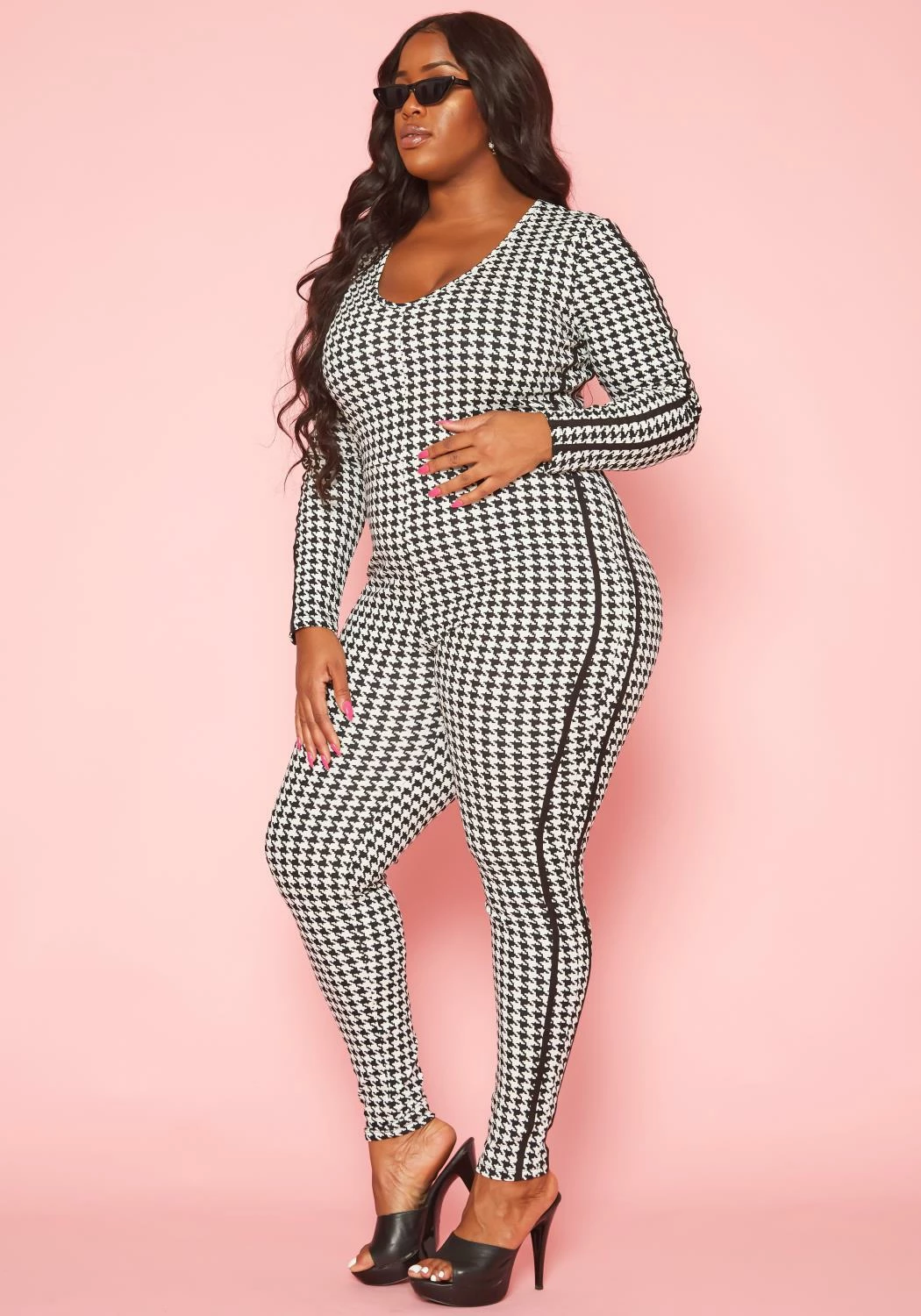 Stunning plus size women’s jumpsuit in houndstooth plaid pattern, v-neck style, long sleeves, bodycon fitting and back zipper closure.