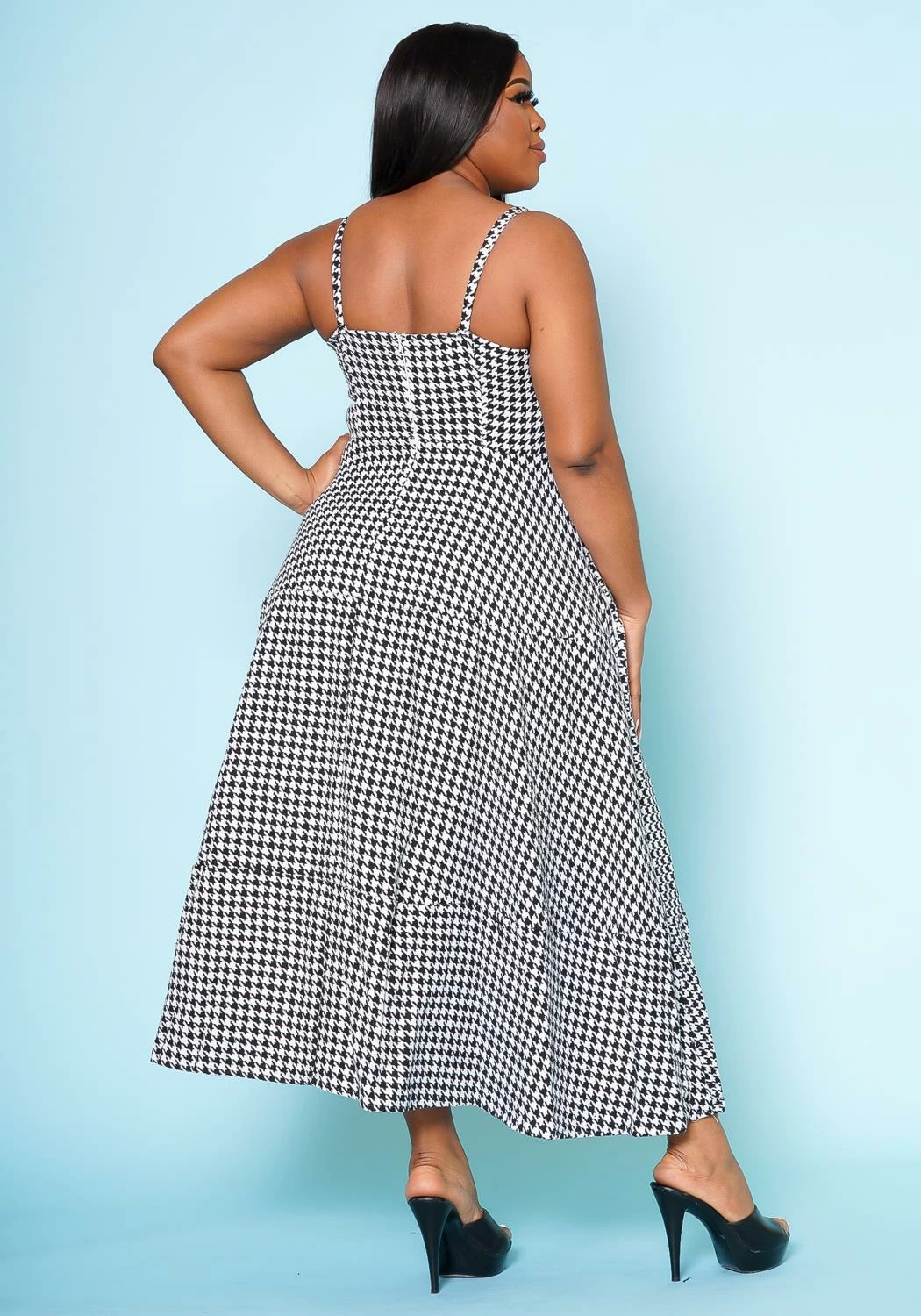 Plus size women’s maxi dress in houndstooth pattern, cami shoulder straps, sweetheart neckline and back zipper closure.