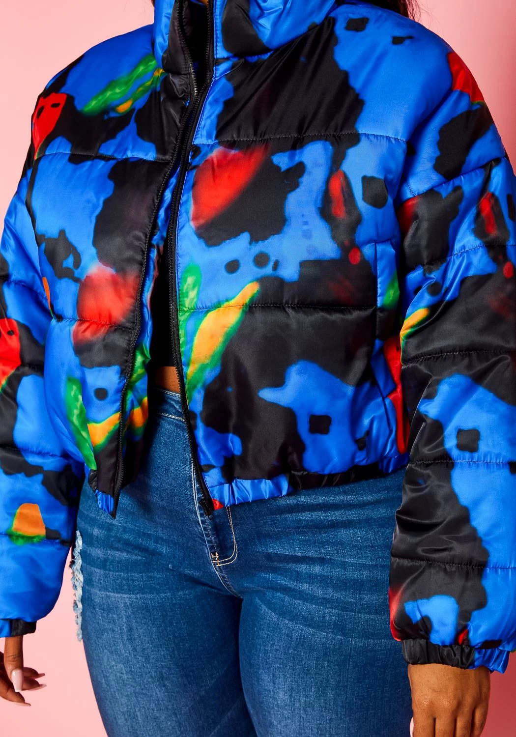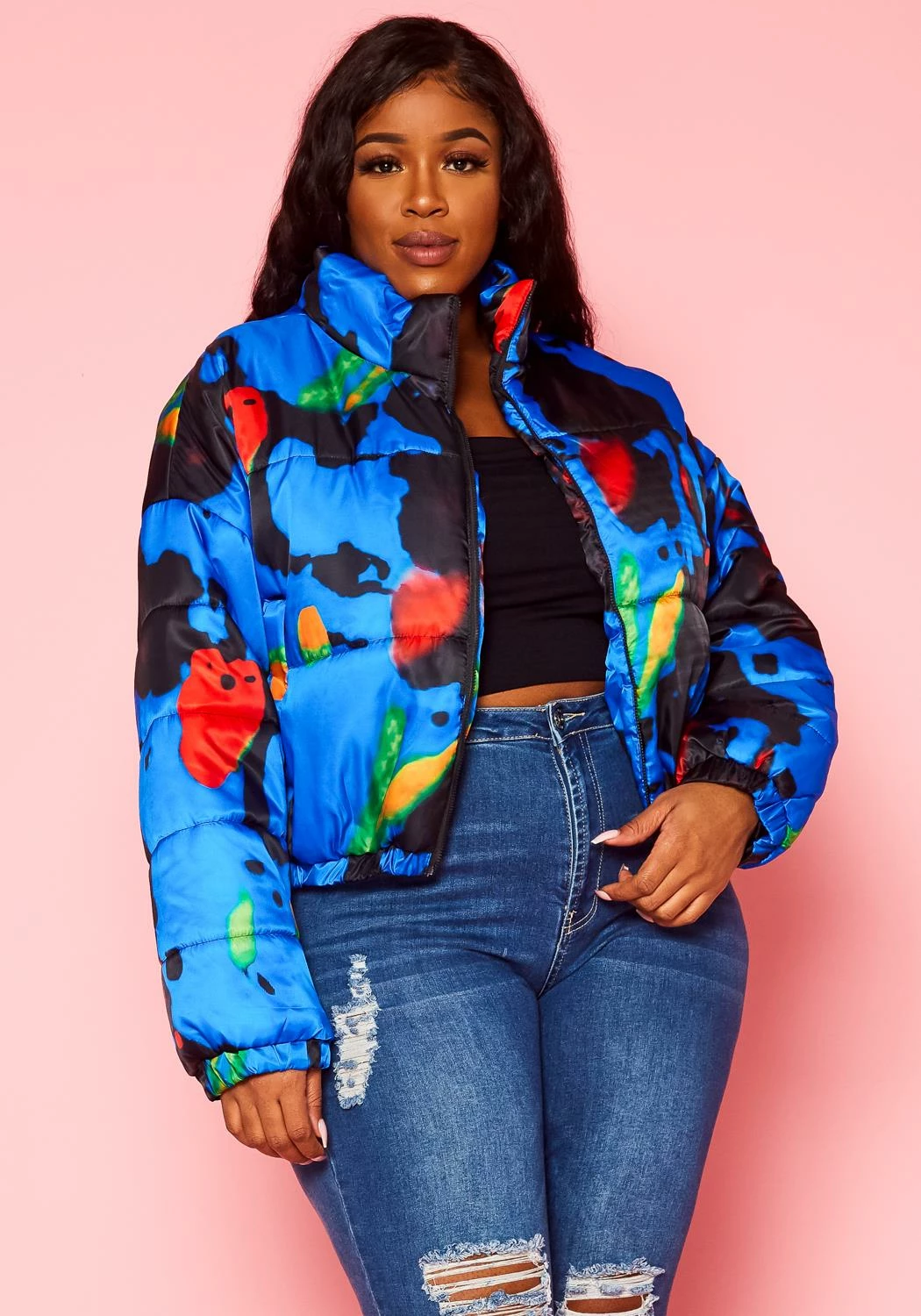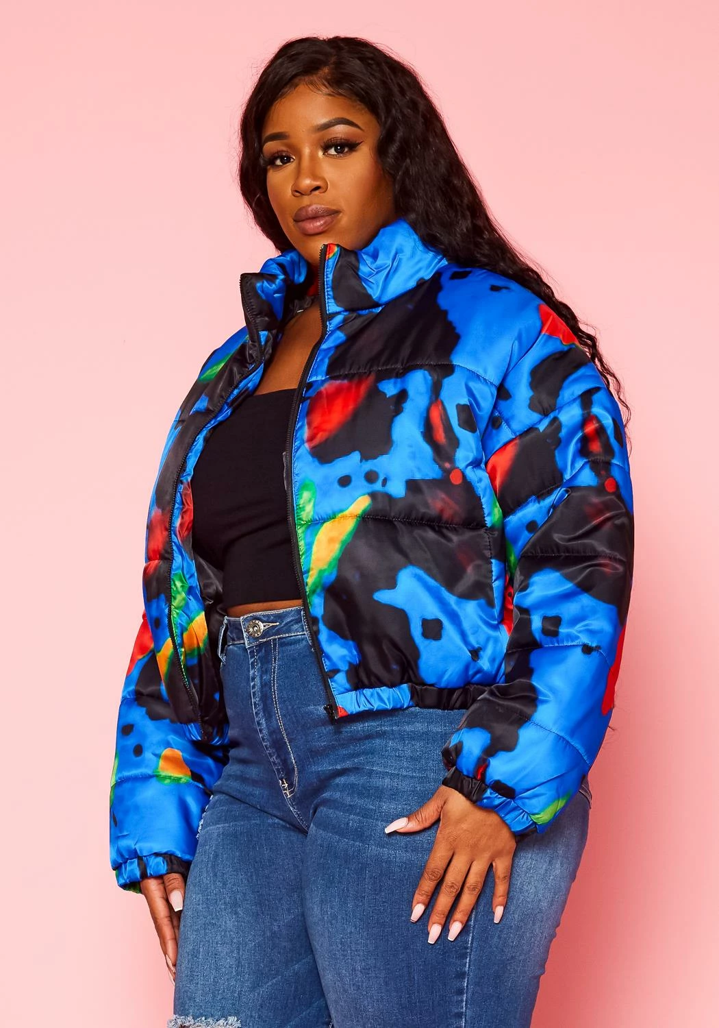 Trendy plus size women’s puffer jacket in high neck style, front zipper closure, cropped fit and side pocket ascent.