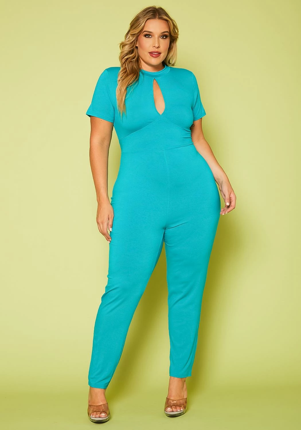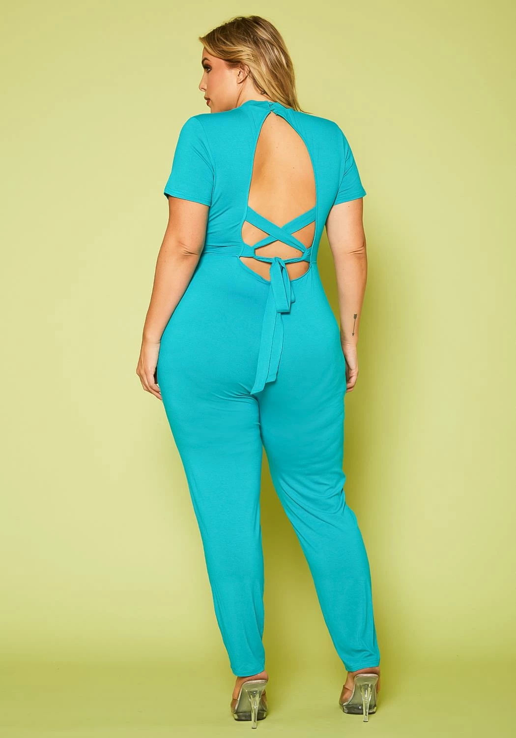 Must have plus size women’s jumpsuit in casual design which features front key hole design, short sleeves & back criss cross tie up closure.