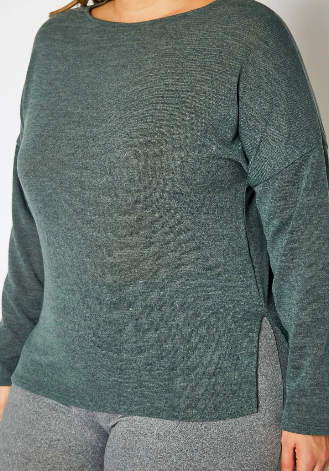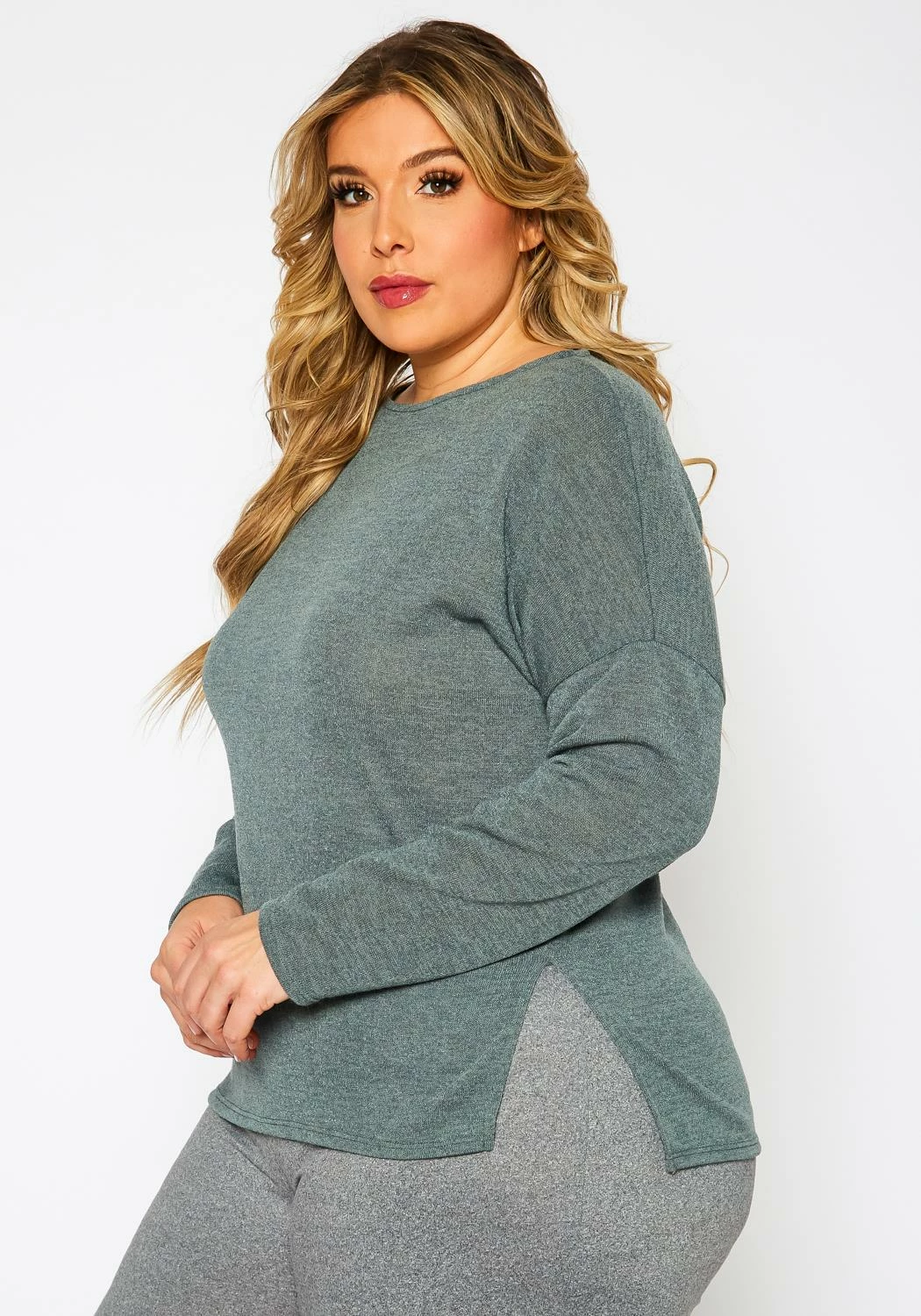 Plus size women’s long sleeve top in light knit material and side slit hem detail.