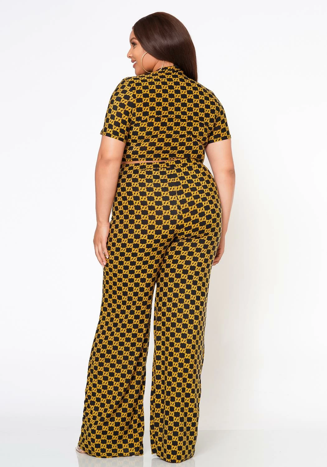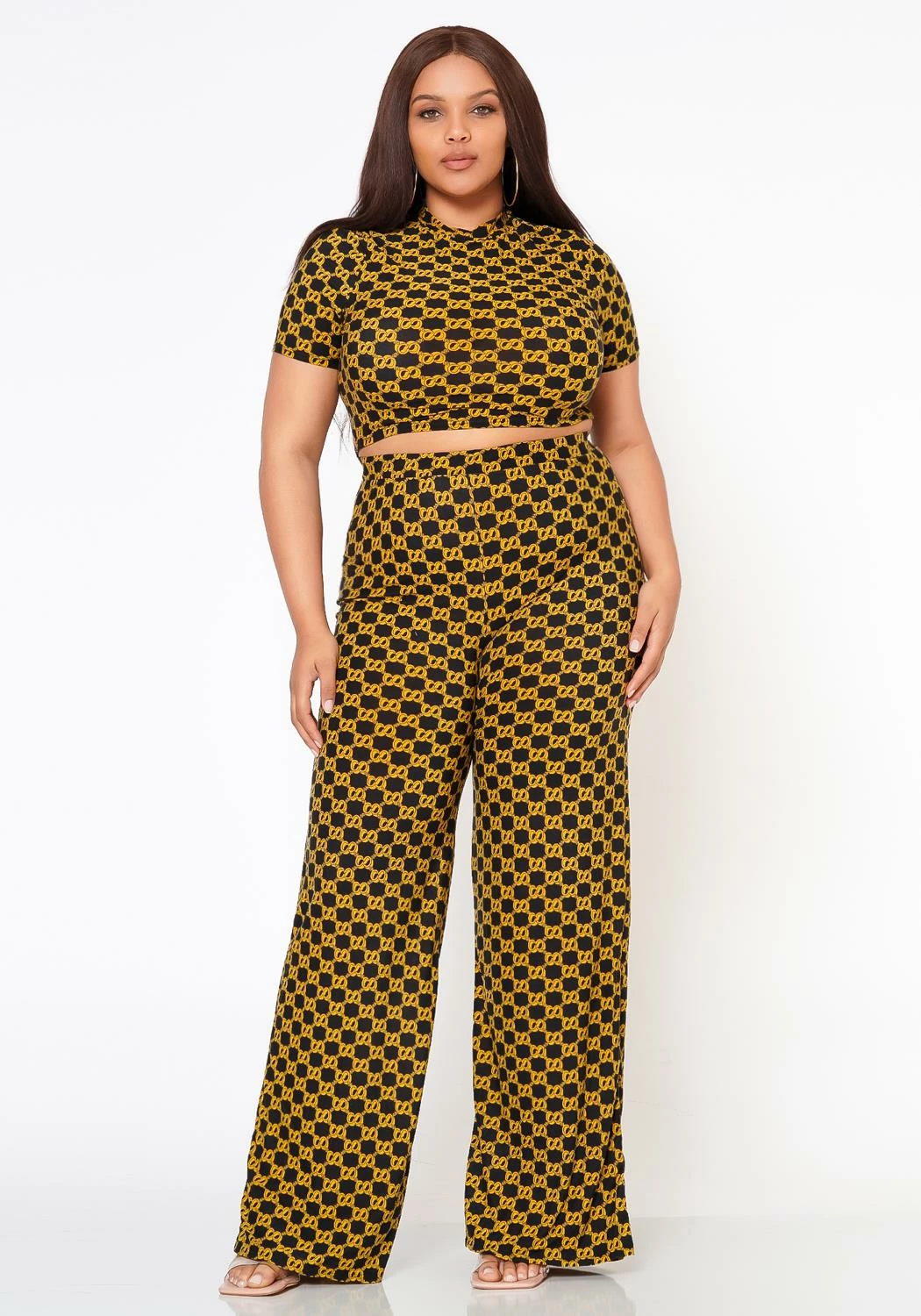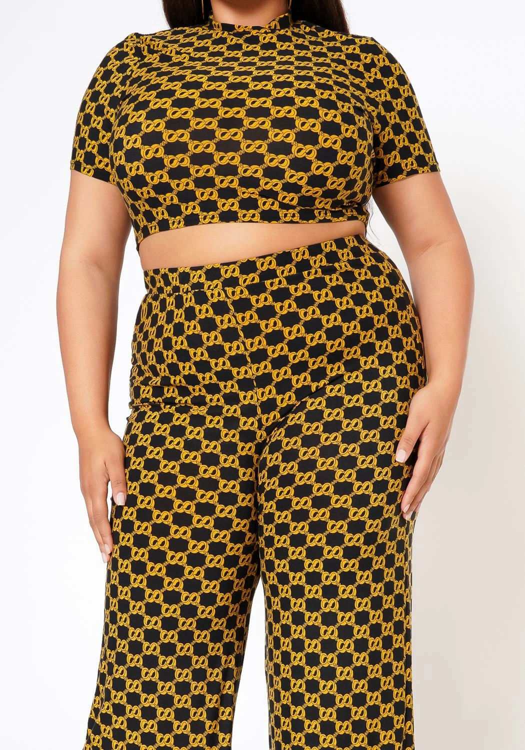 Alluring plus size women’s matching set which features a golden CC link pattern mock neck, short sleeve crop top and high waist flare leg dress pants.