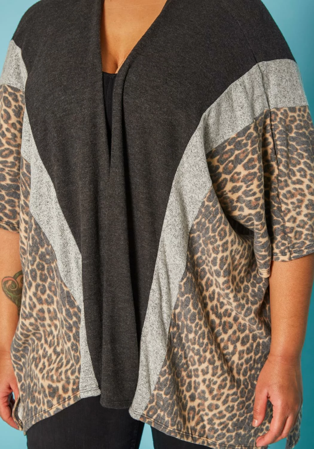 Relaxed fit plus size women’s cardigan in leopard print, color block design, open front style and short dolman sleeves.