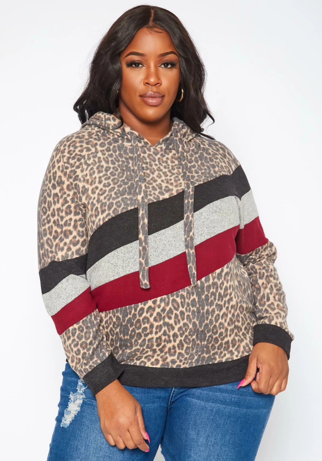 Plus size women’s basic hooded sweater in leopard print, color block design, hoodie drawstrings and lightweight fitting.