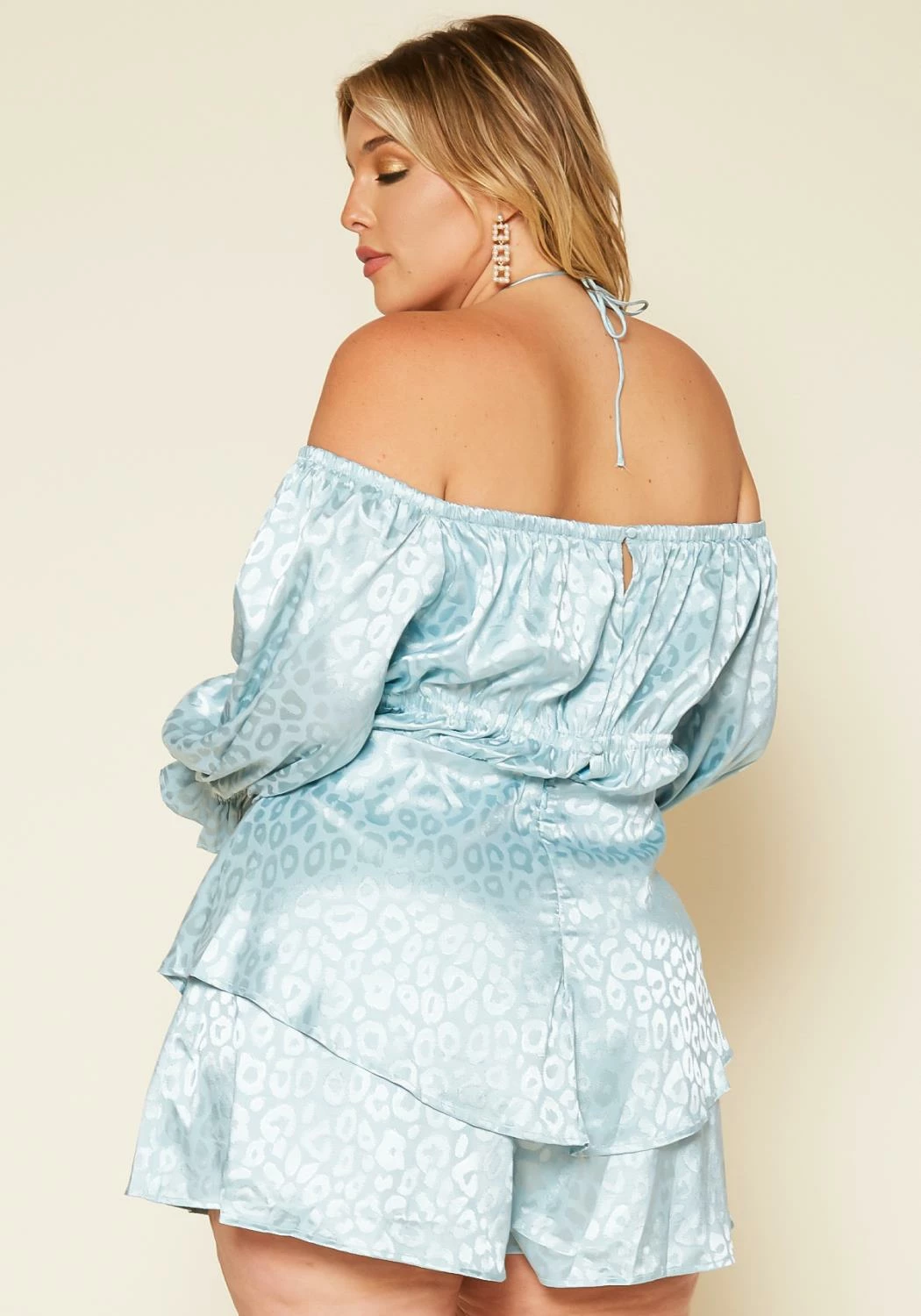 Dreamy satin romper in leopard print, off shoulder style, halter neck tie, long sleeves, peplum flare and ruched details.