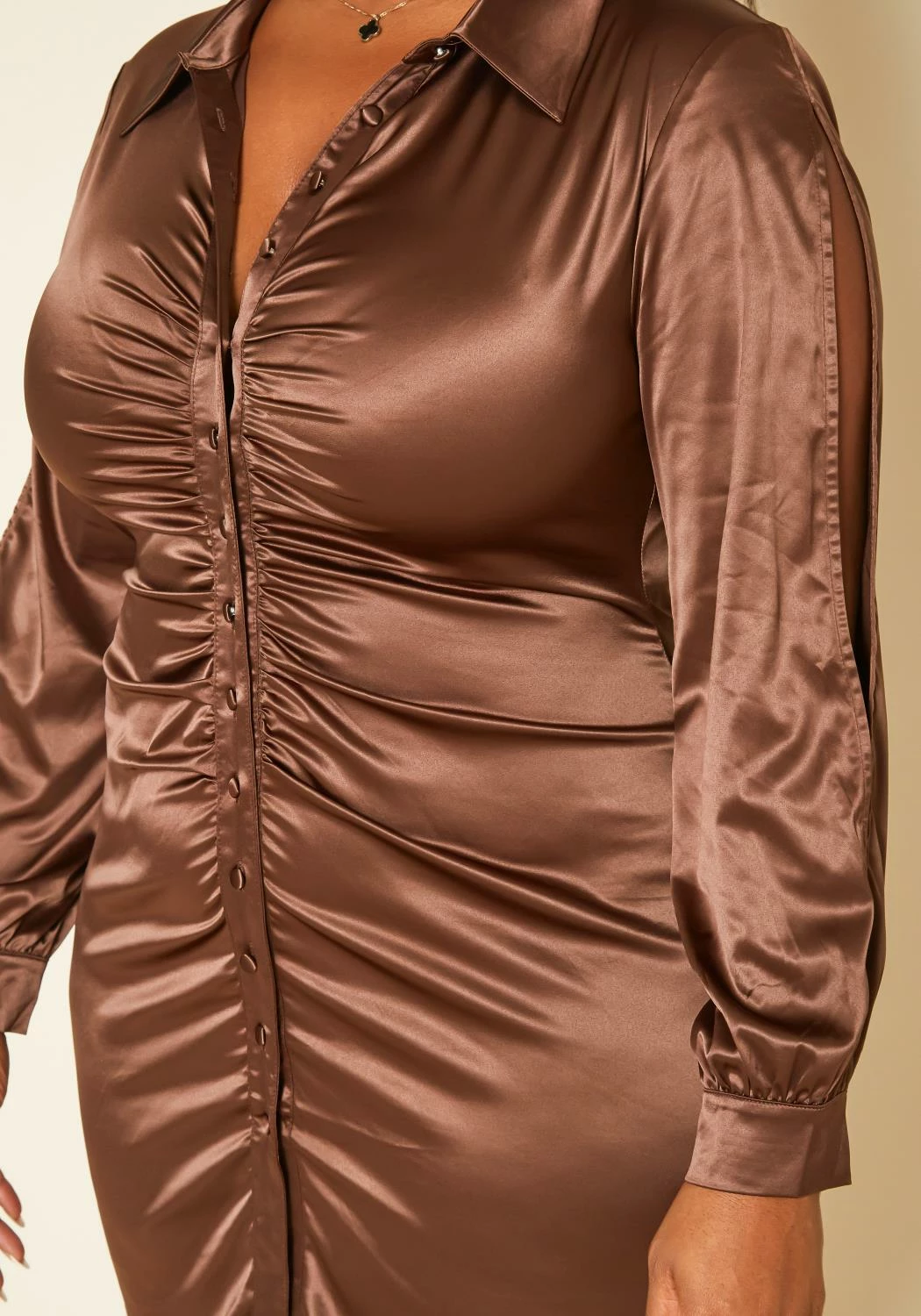 Trendy for fall plus size women’s satin mini dress with collar neck style, slit hem long sleeves, buttoned wrist cuffs, ruched hem and button front closure.