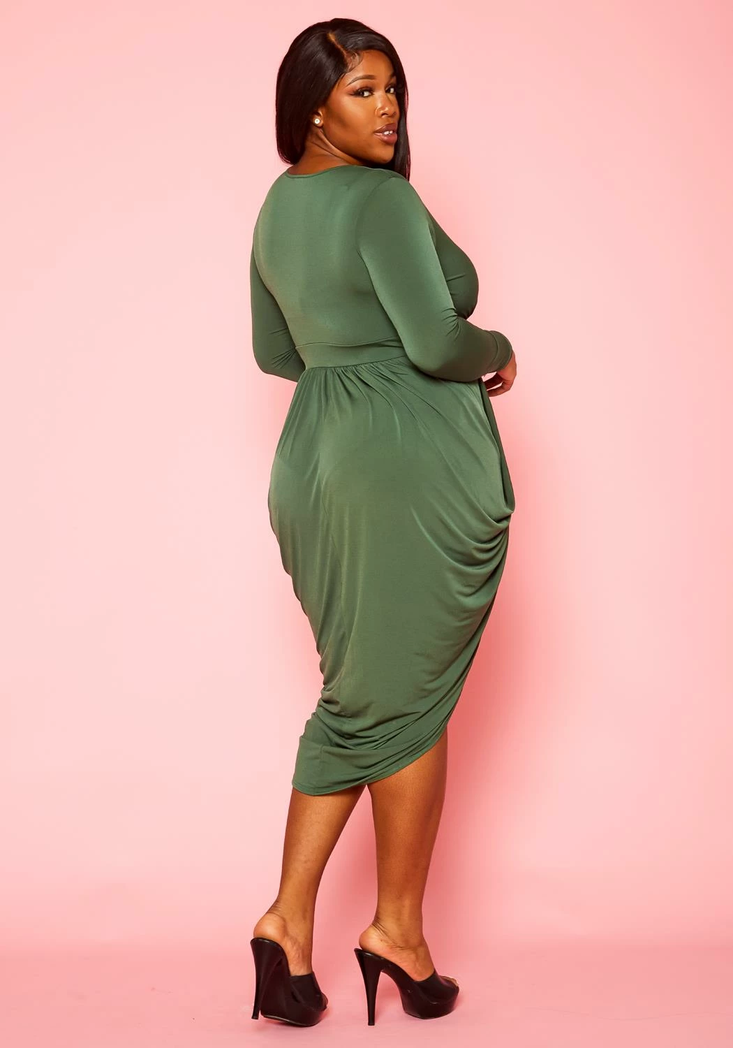 Romantic plus size women’s midi dress with draped design, fitted long sleeves, narrow surplice and overlay hem.