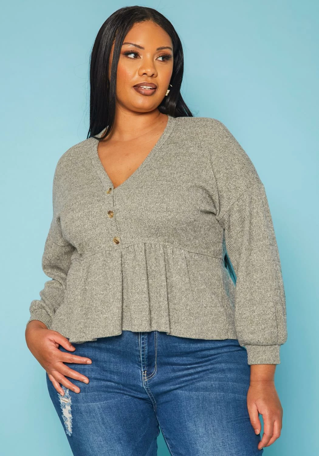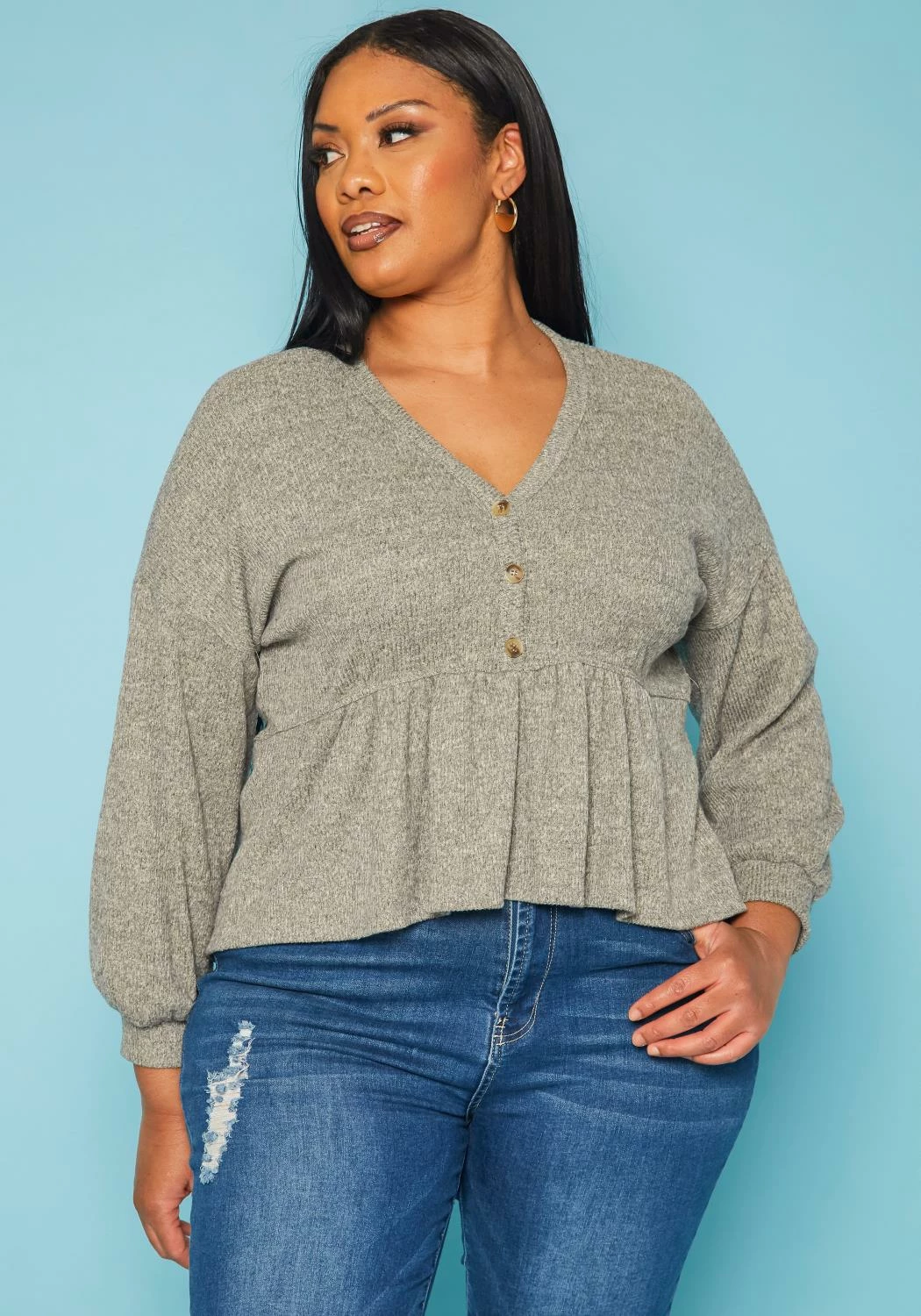 Lovely plus size women’s knit top in peplum flare design, v-neck style, button hem and long sleeves with fitted wrist cuffs.
