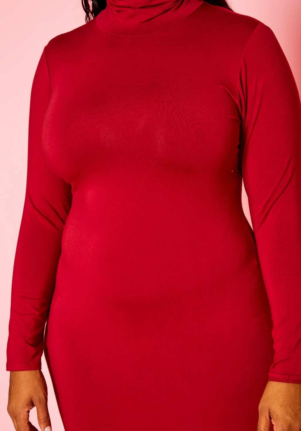 Simply effortless plus size women’s maxi dress with mermaid flare hem, fitted long sleeves and mock neck style.