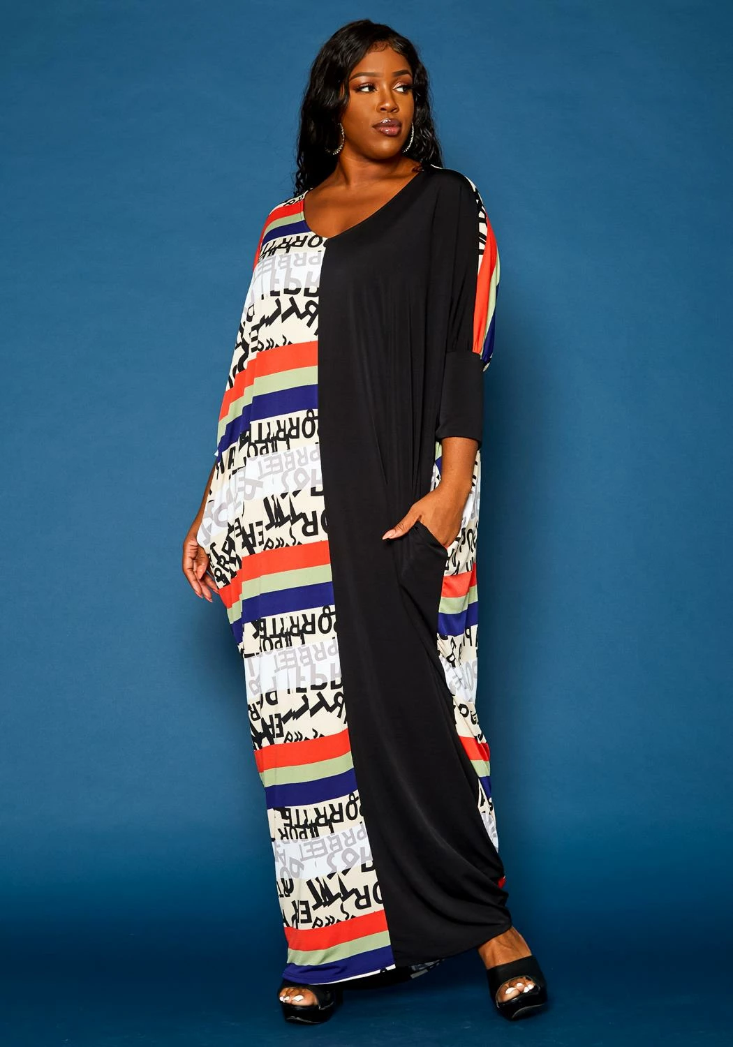 Plus size women’s maxi dress in multi pattern splice design, v-neck style, 3/4 long sleeves and pocket hem.