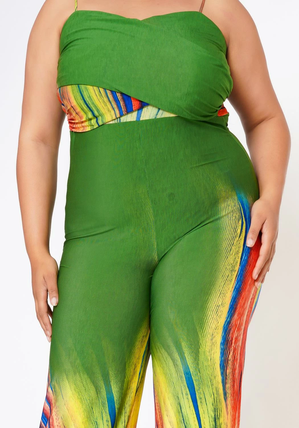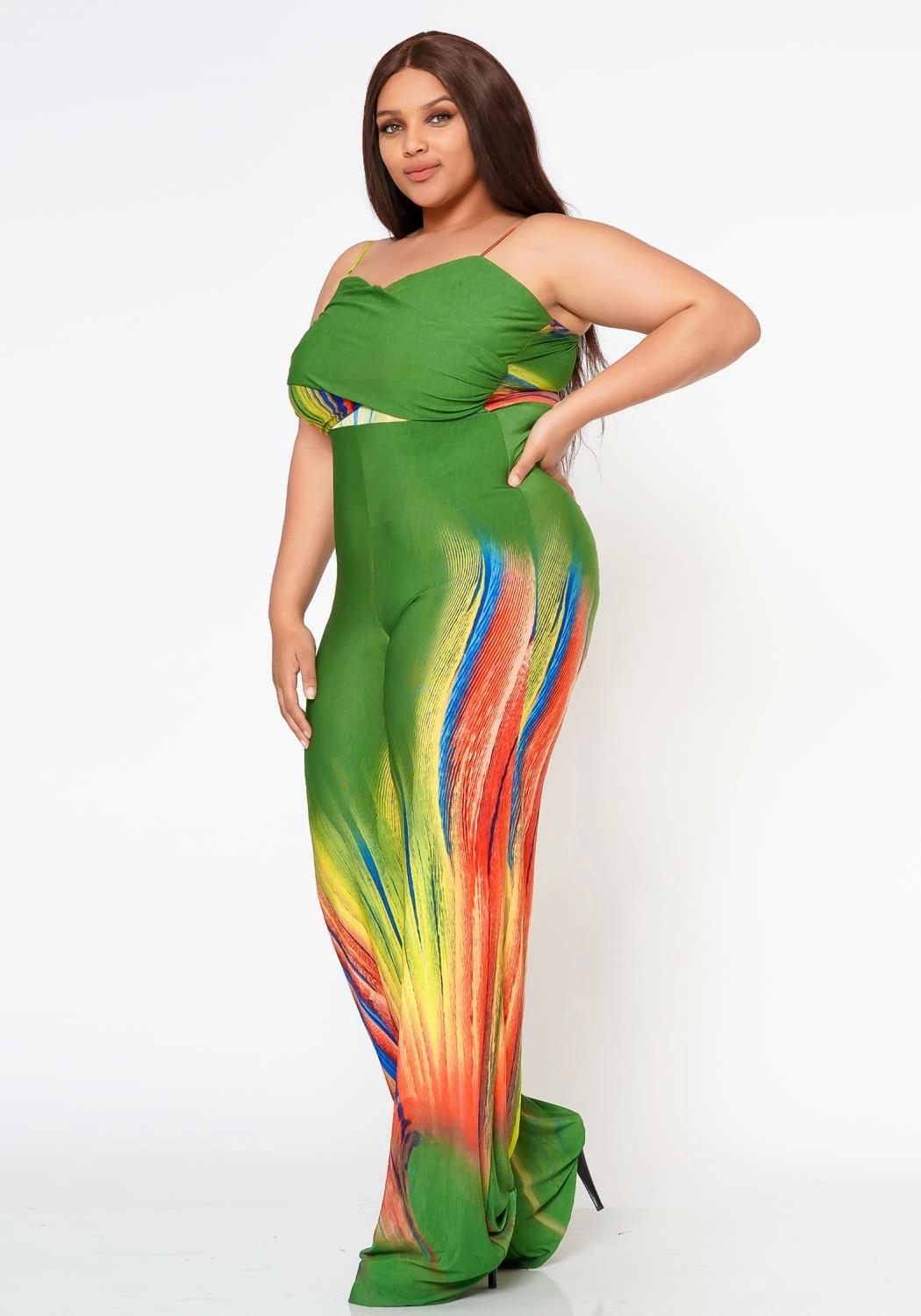 Gorgeous summer vibe cami jumpsuit in multi pattern, flare leg style, overlay hem and ruched back detailing. Made with our favorite slinky material.