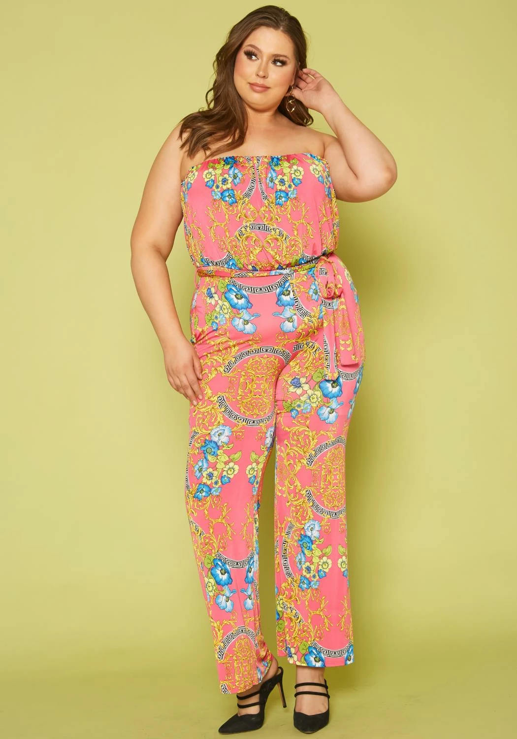 Plus size women’s tube jumpsuit with elastic waist, flare leg hem and vivid floral prints.