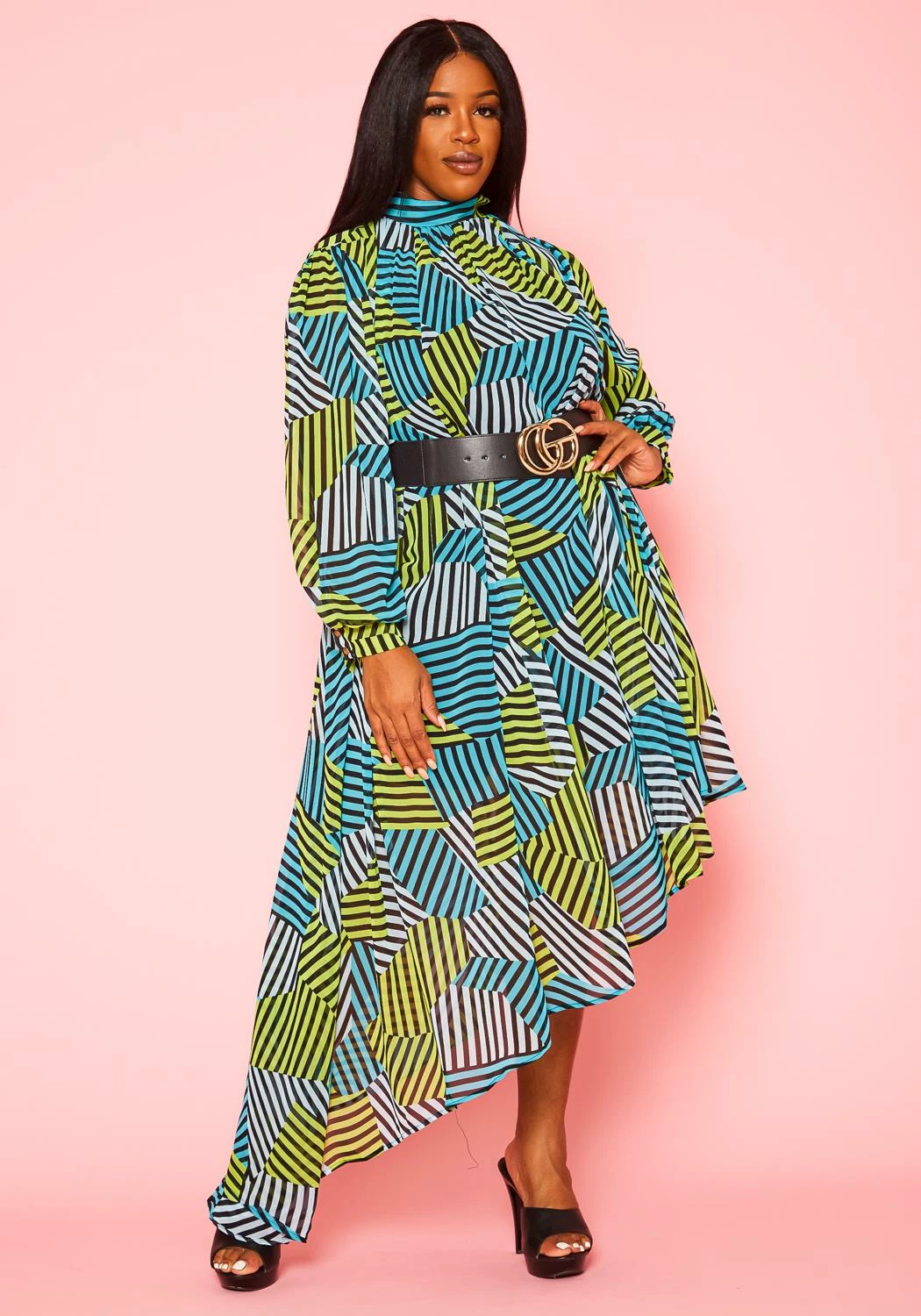 Effortless plus size women’s maxi dress with multi striped design, mock neck style, long sleeves, asymmetric hem and matching waist belt.