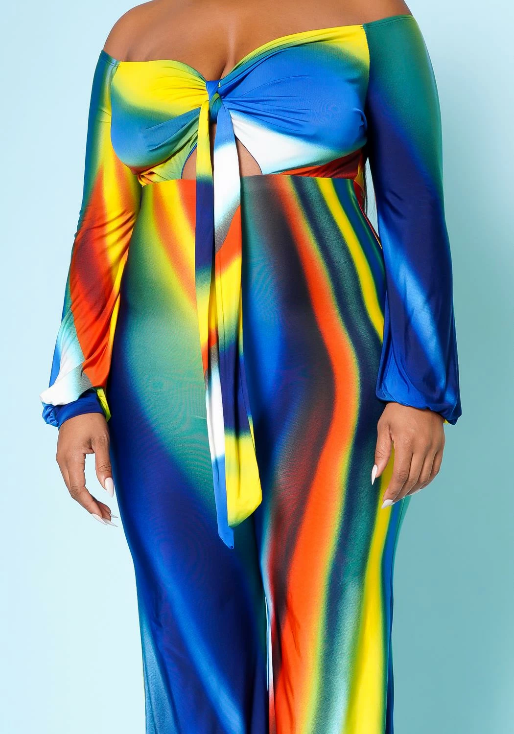 Make a statement with our Plus Size Multicolor Wide Leg Jumpsuit. The unique multicolor design is eye-catching and perfect for any occasion. The jumpsuit features a v-neck style with a tie front detail and front key-hole ascent, adding a touch of elegance to the overall look. The long-sleeve cuff hem provides coverage, while the wide flare leg hem adds a trendy touch. The jumpsuit has a moderate stretch, ensuring a comfortable and flattering fit. The tie-up detail can also be versatile, allowing you to adjust the fit to your liking. Step out in confidence with this fashionable jumpsuit that is perfect for any season.