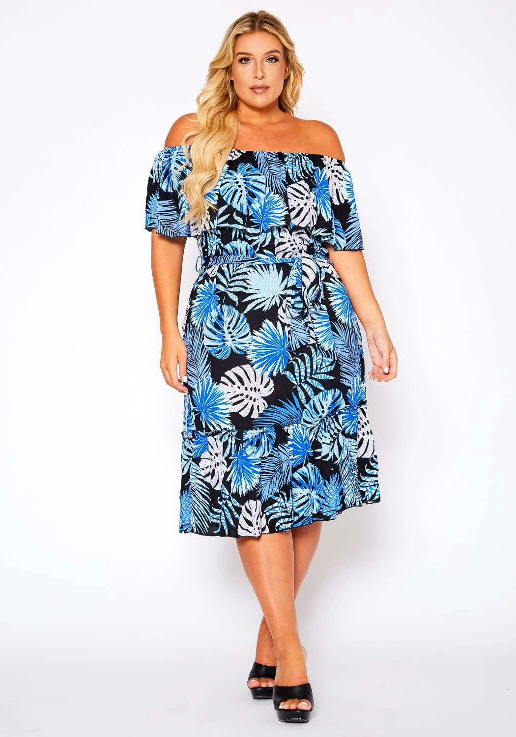 Perfect vacation plus size women’s dress, featuring off shoulder hem, elastic waist detail with detachable waist tie up ascent, side loop holes & tiered hem.