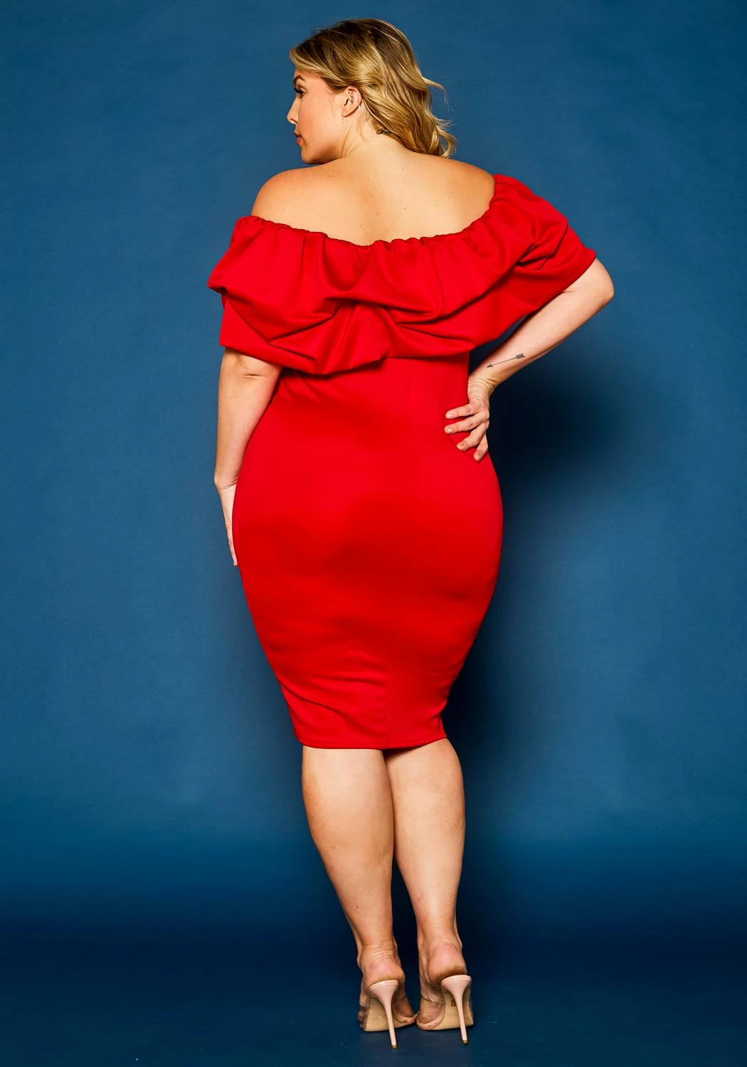 Lovely plus size women’s cocktail dress with off shoulder ruffle hem design and bodycon fitting.