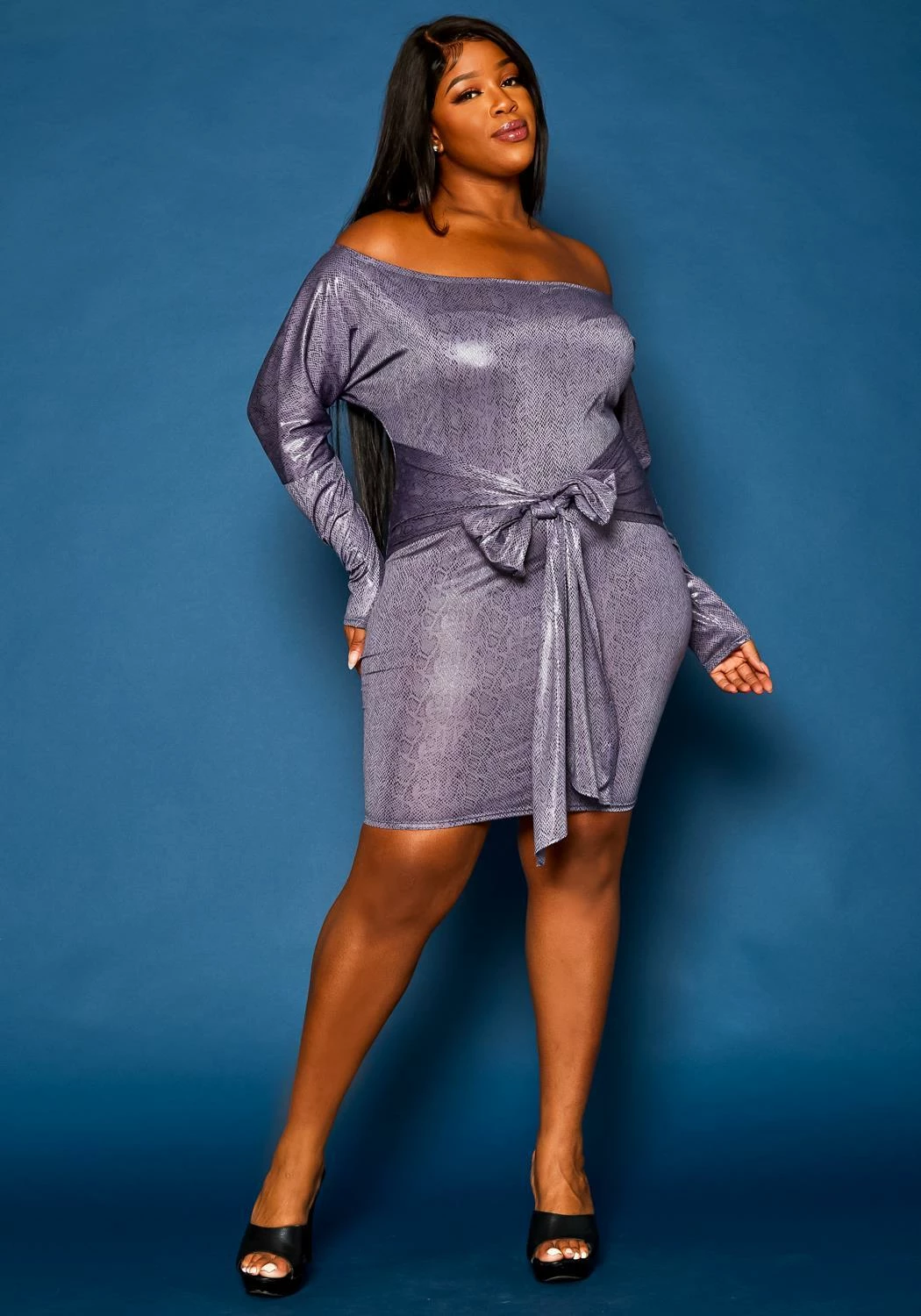 Girls night out bodycon mini dress in off shoulder style, snack pattern, dolman long sleeves and waist tie hem.