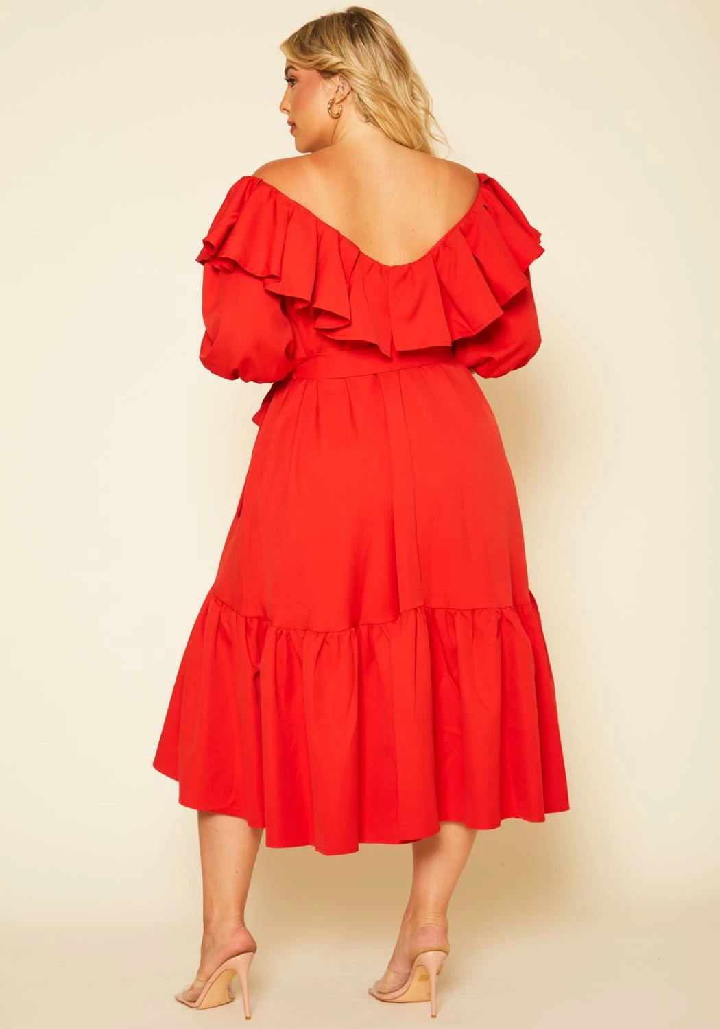Romantic plus size women’s midi dress features an off shoulder style, half puff sleeves, waist tie ascent and wide flare design.