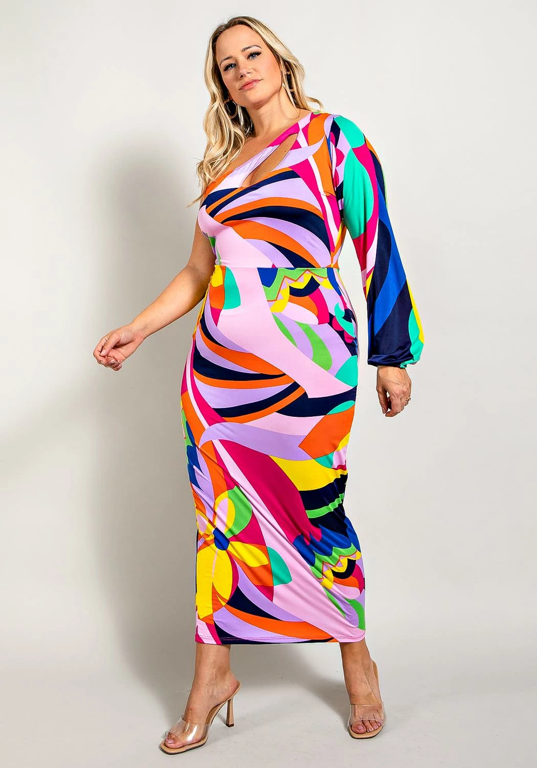 A vencia knit dress featuring an allover abstract print, one shoulder neckline, front cutout detail, long puff sleeve, and a bodycon silhouette.