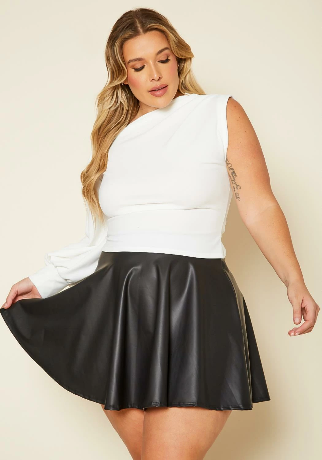 One of a kind plus size women’s blouse in one sleeve design, fitted hem.