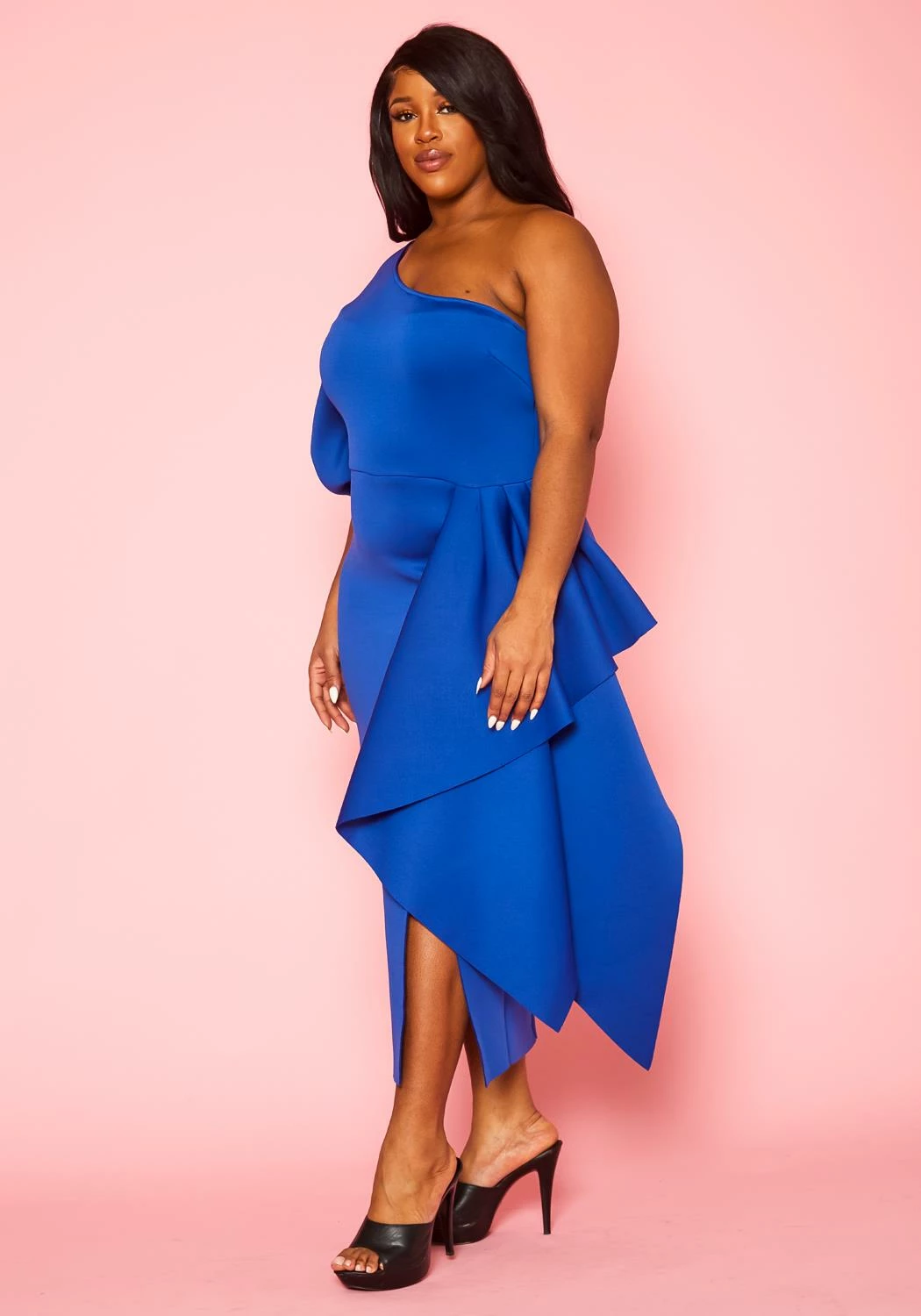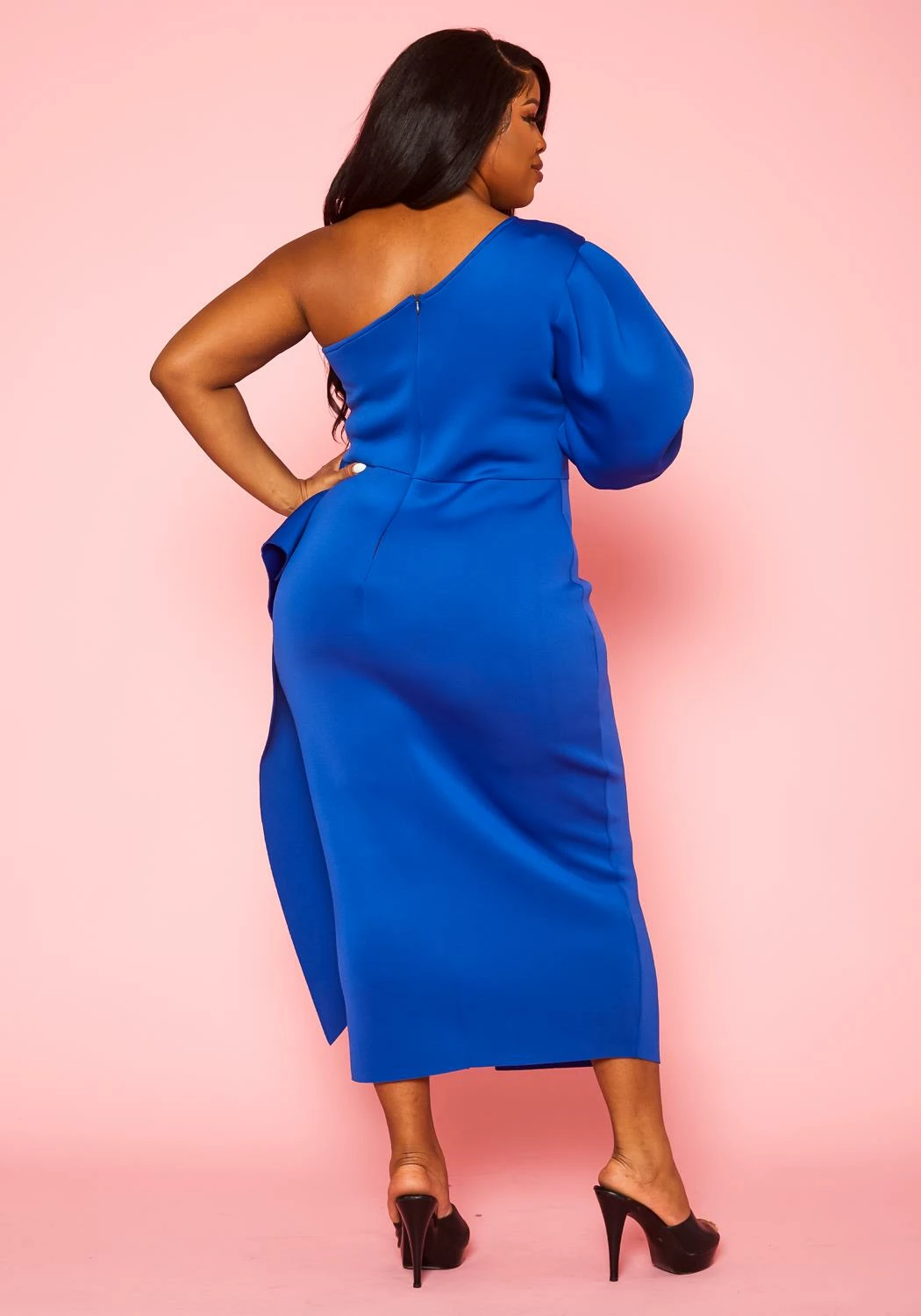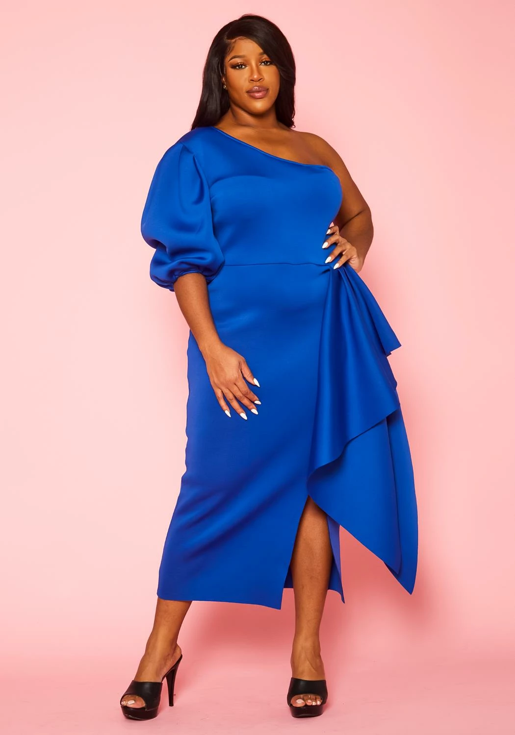 Memorable plus size women’s gown in one sleeve style, drape front details and back zipper closure.