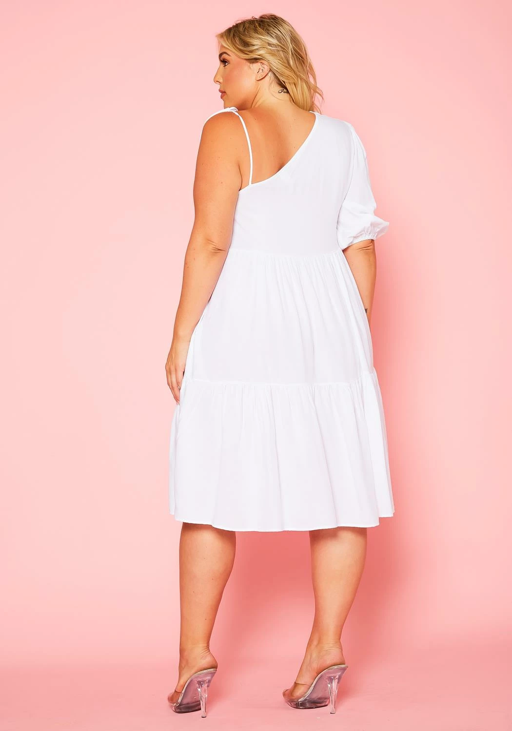Lovely plus size women’s mini dress in one sleeve design, self tie shoulder strap and wide flare style.