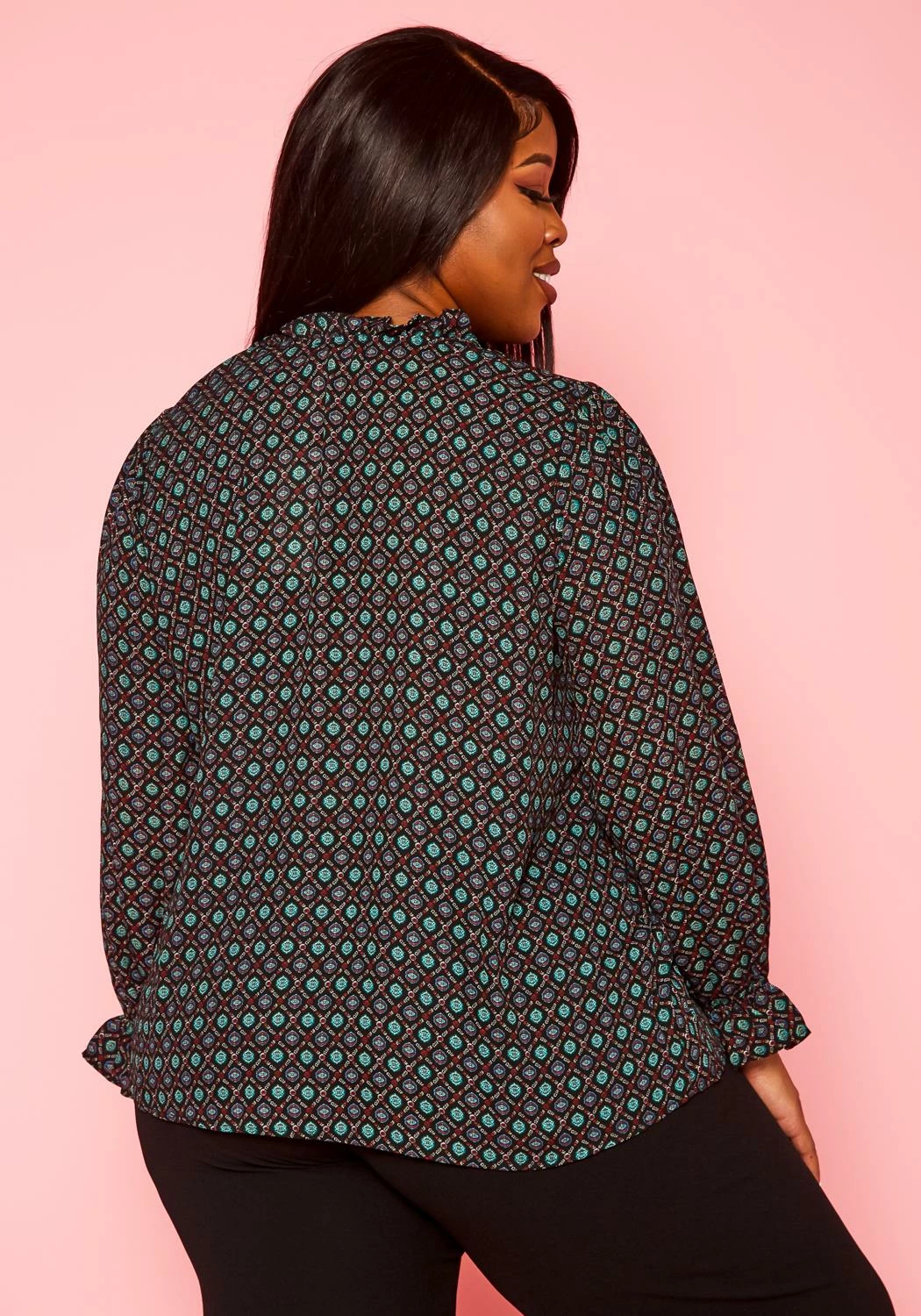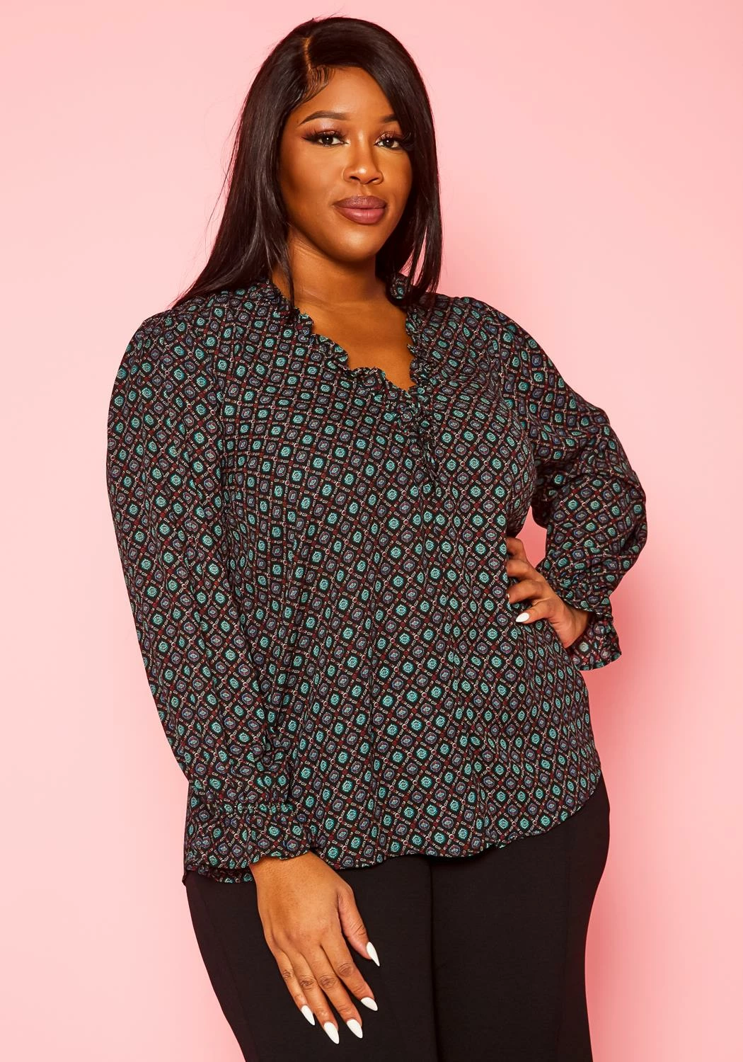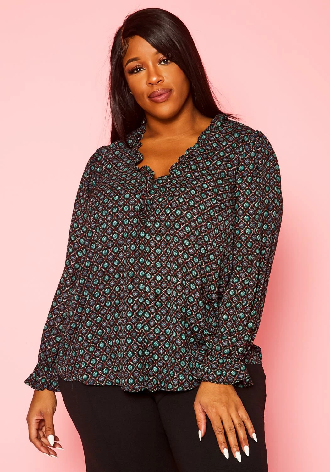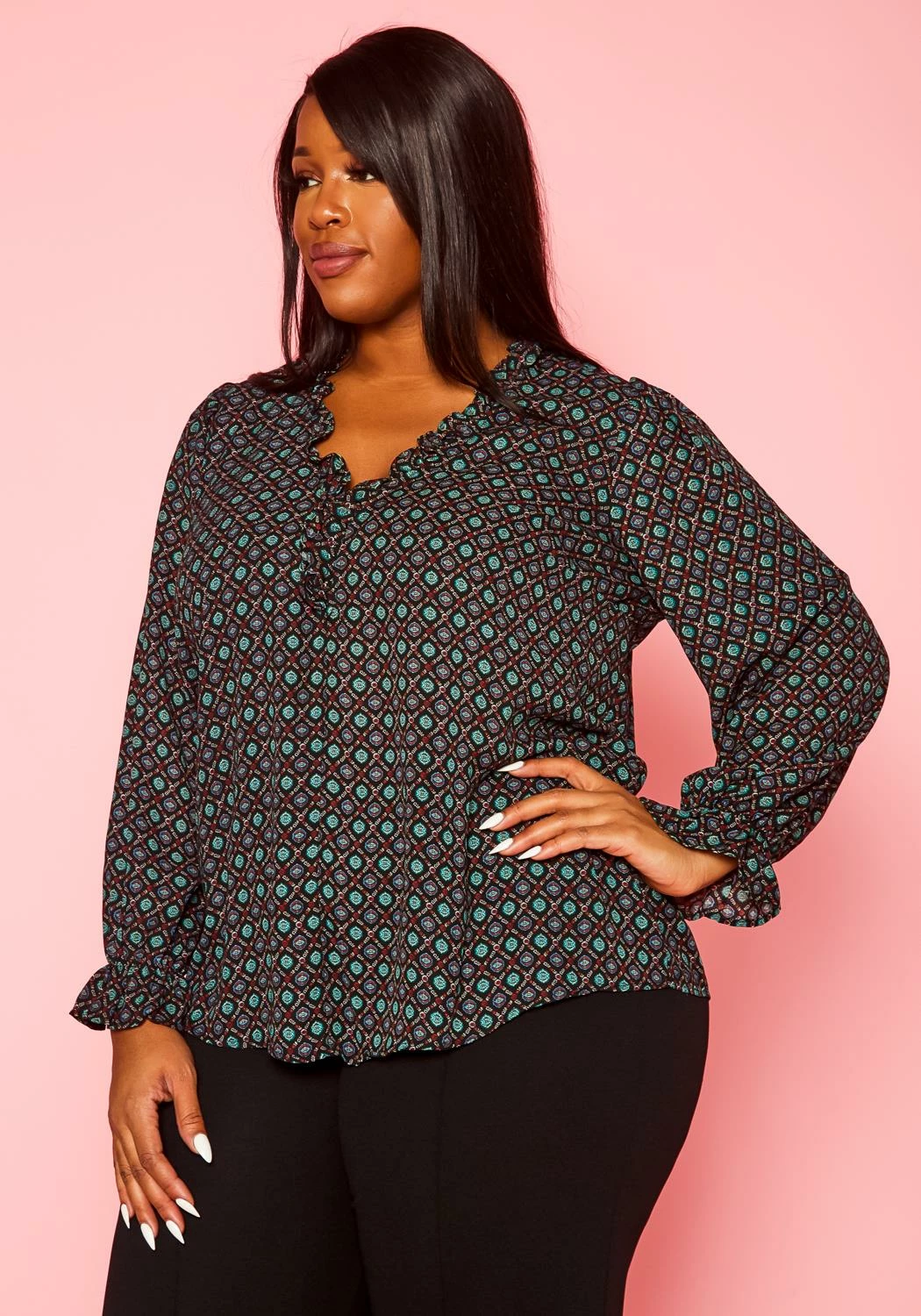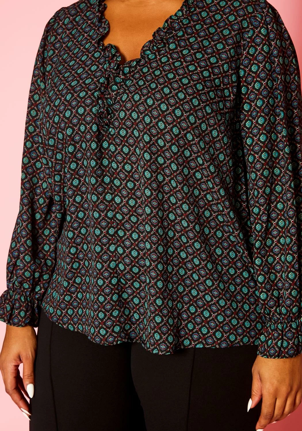 Modern plus size women’s long sleeve blouse in oriental pattern, ruffle hem v-neckline and flared wrist cuffs.