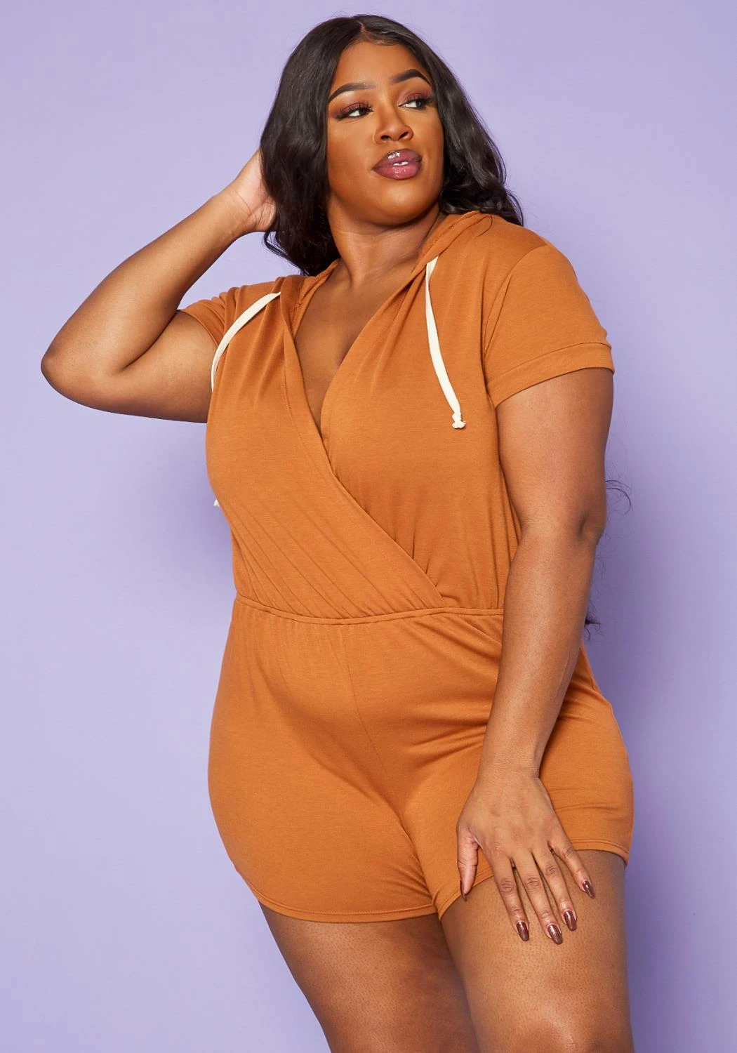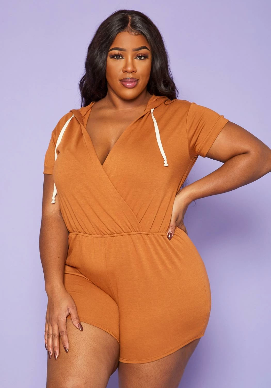 Plus size women’s romper in overlap v-neck style with drawstring detail, hooded design and elastic waistline.