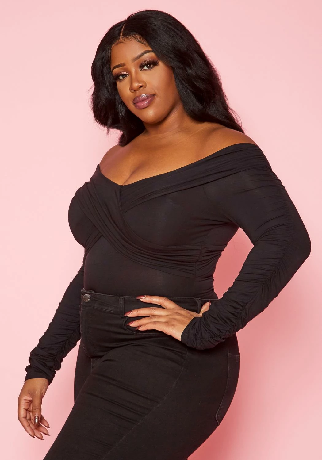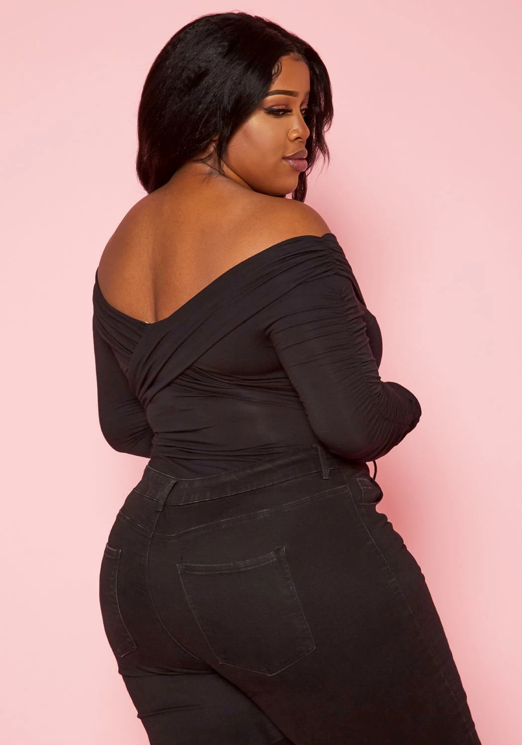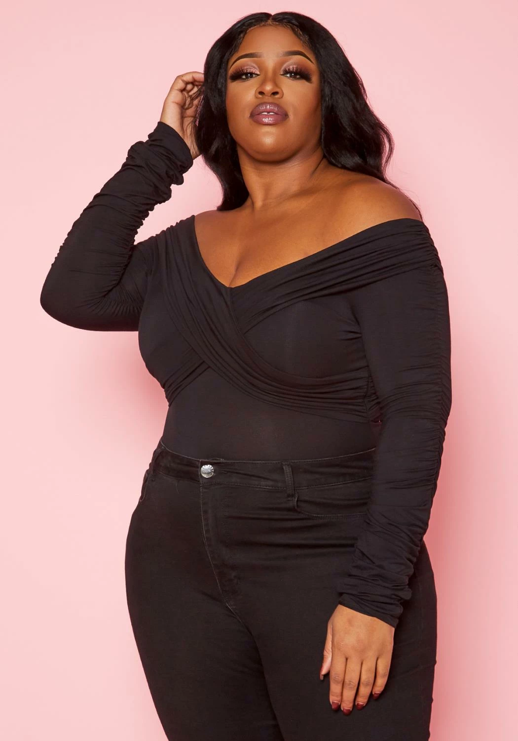 Plus size women’s bodysuit in off-shoulder style featuring v-neck hem with an over layered front and back detail with ruched long sleeves.