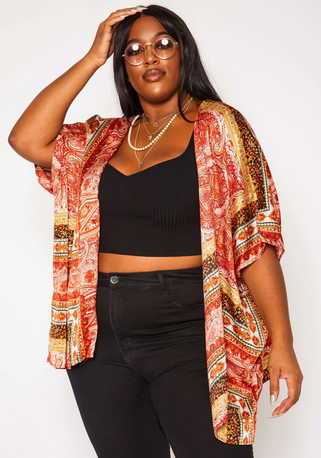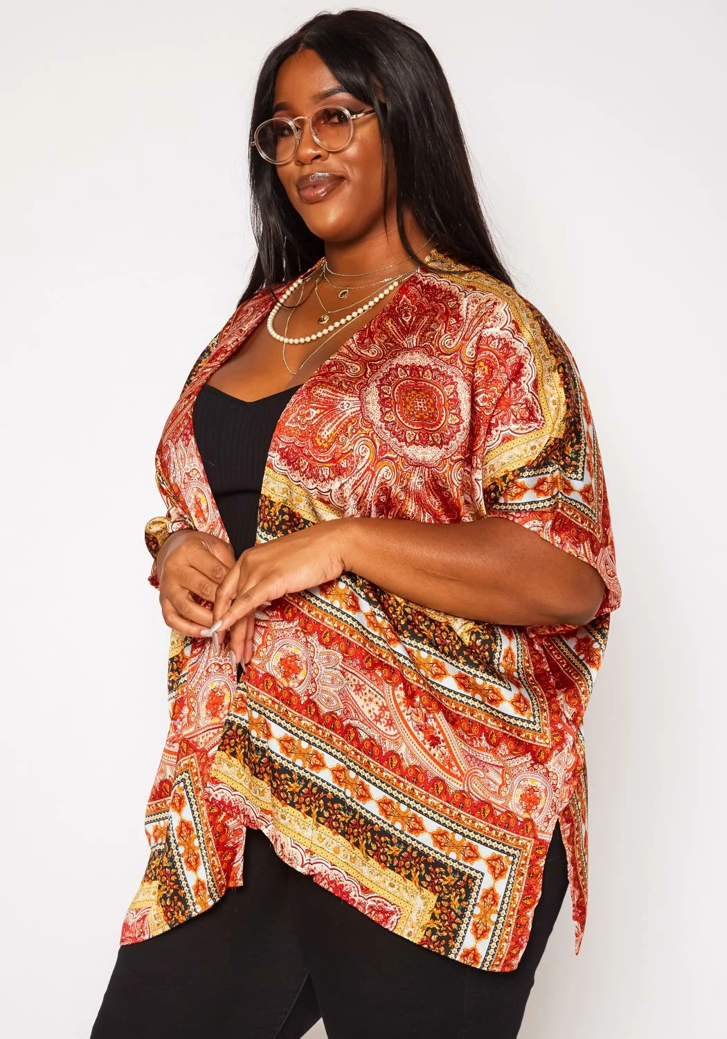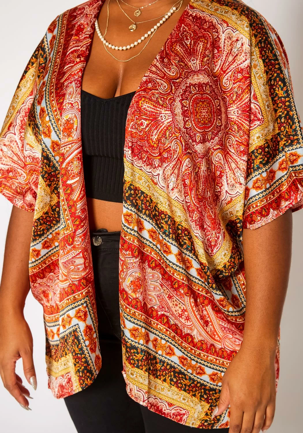 Plus size women’s fresh kimono cardigan in paisley pattern, open front style and short sleeves.