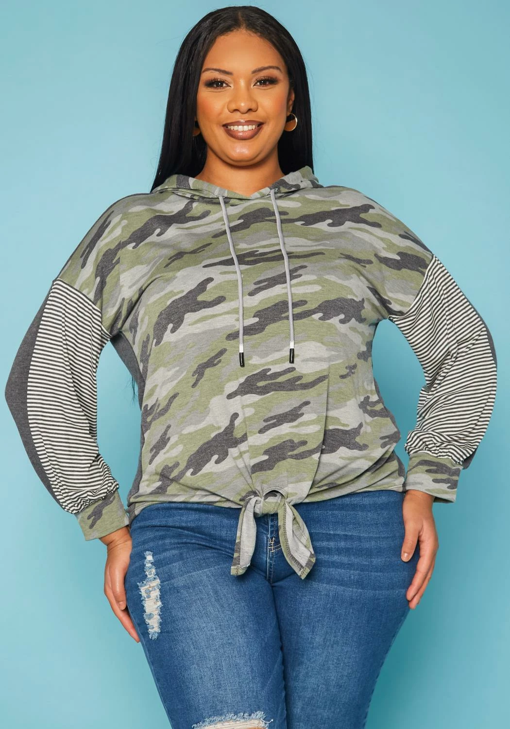 Stylish plus size women’s hooded sweater in patter splice design, hoodie drawstrings and tie front ascent.