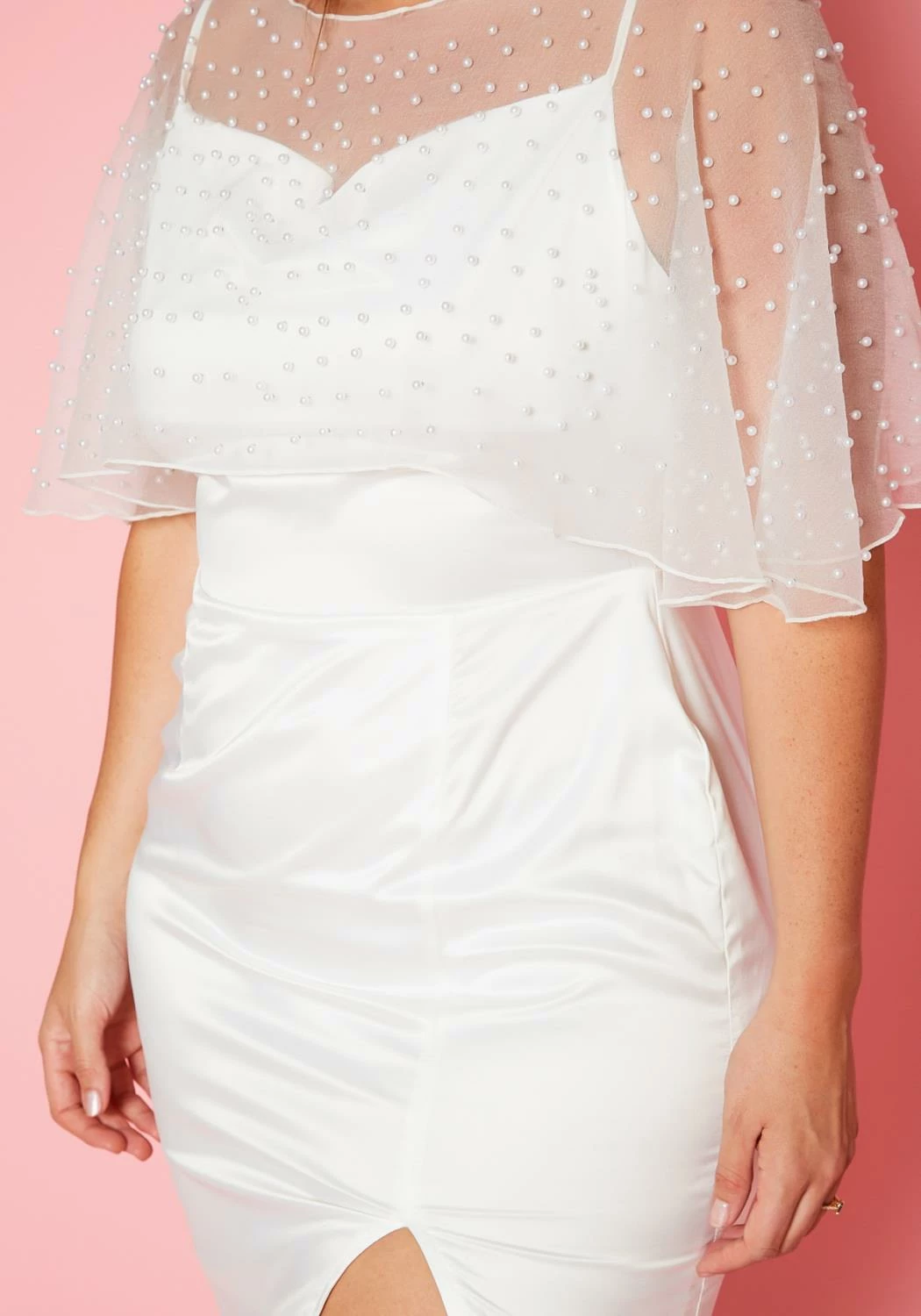 Romantic plus size women’s midi dress in satin material, cowl neck front, cami shoulder straps, slit hem and white beaded pearl mesh overlay design.