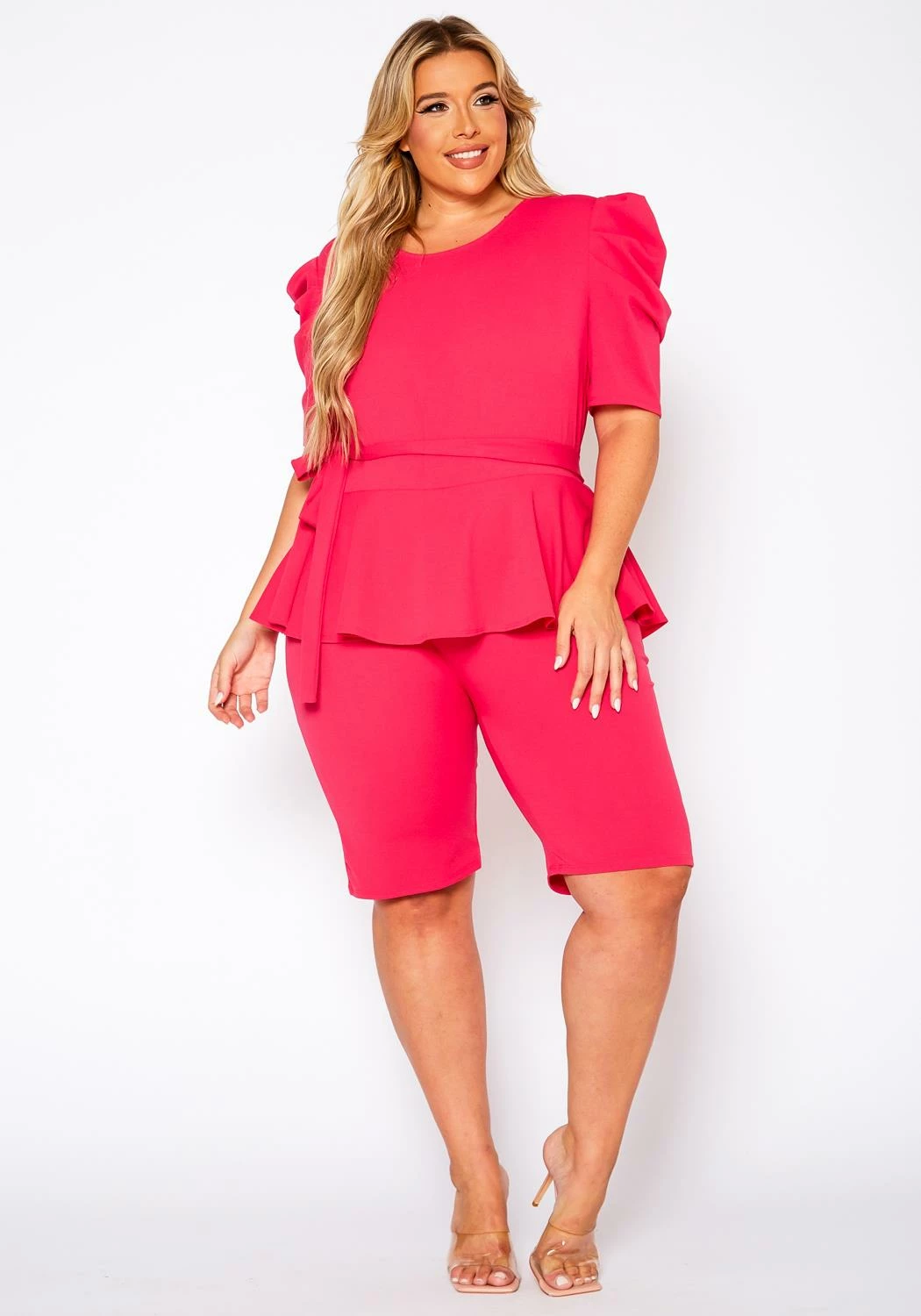 Looks like peplum top and biker shorts set? This is a romper for plus size women which features belted peplum ruffle.