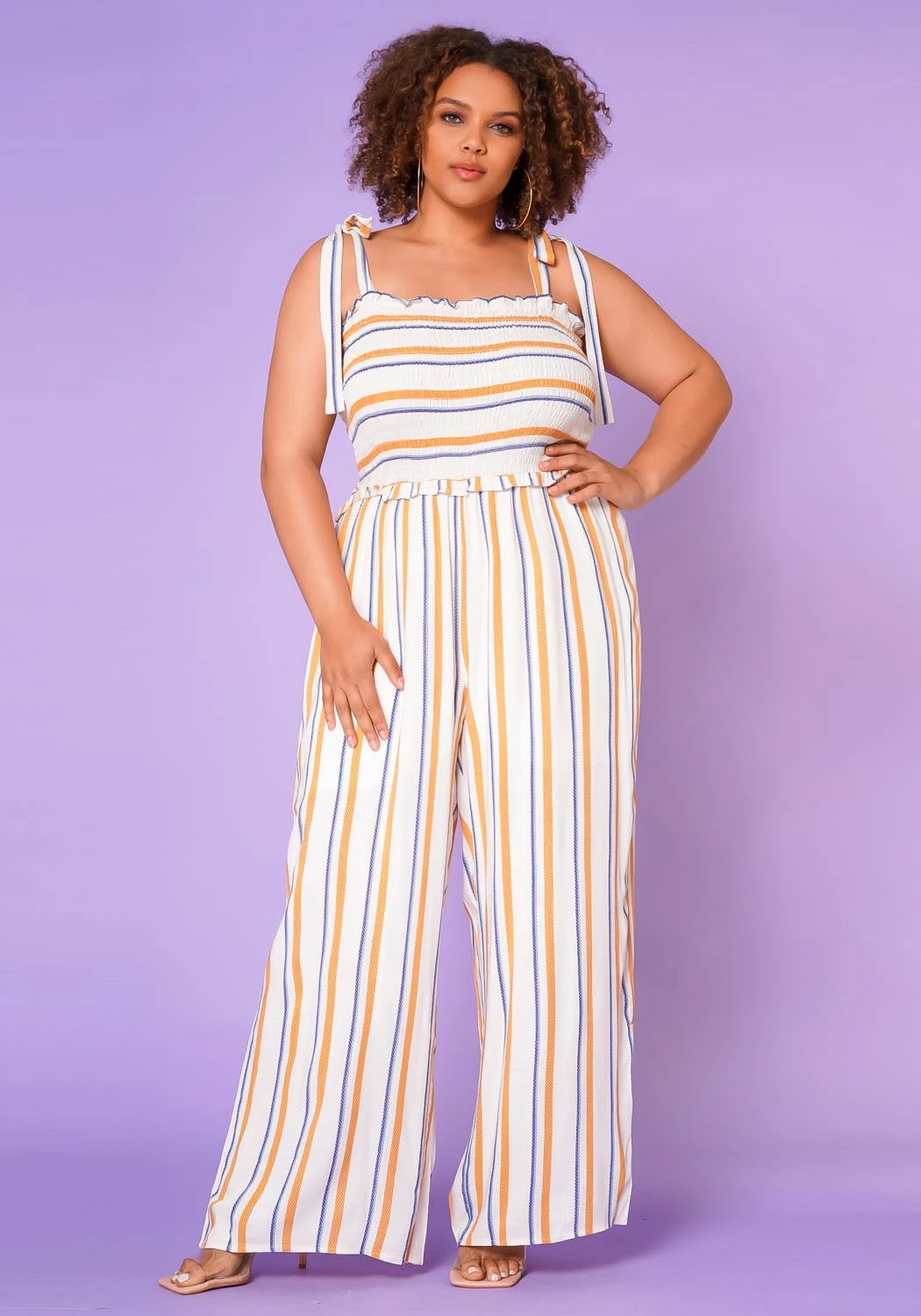 Casual plus size women jumpsuit featuring a multi striped print and smocked top.