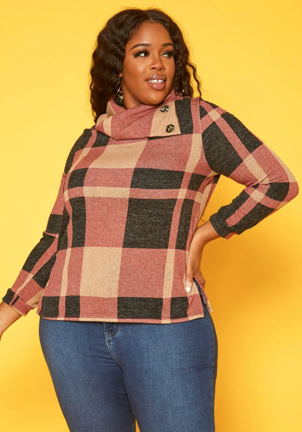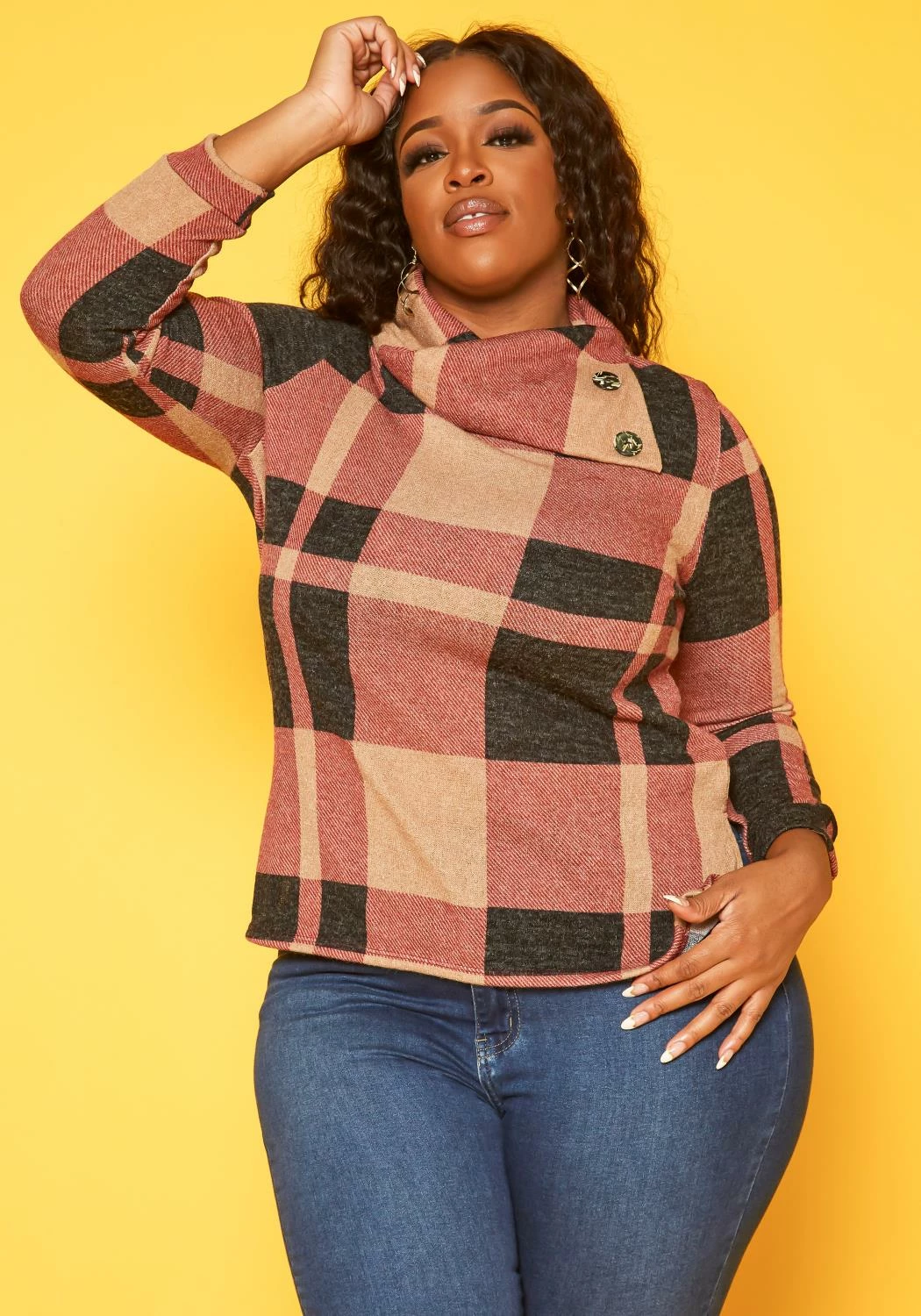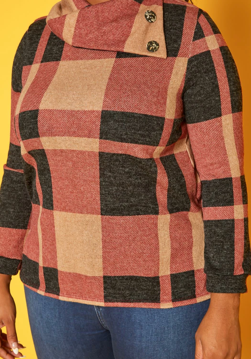 Plus size women’s plaid sweater with high neck asymmetric collar, fitted long sleeves and button details.