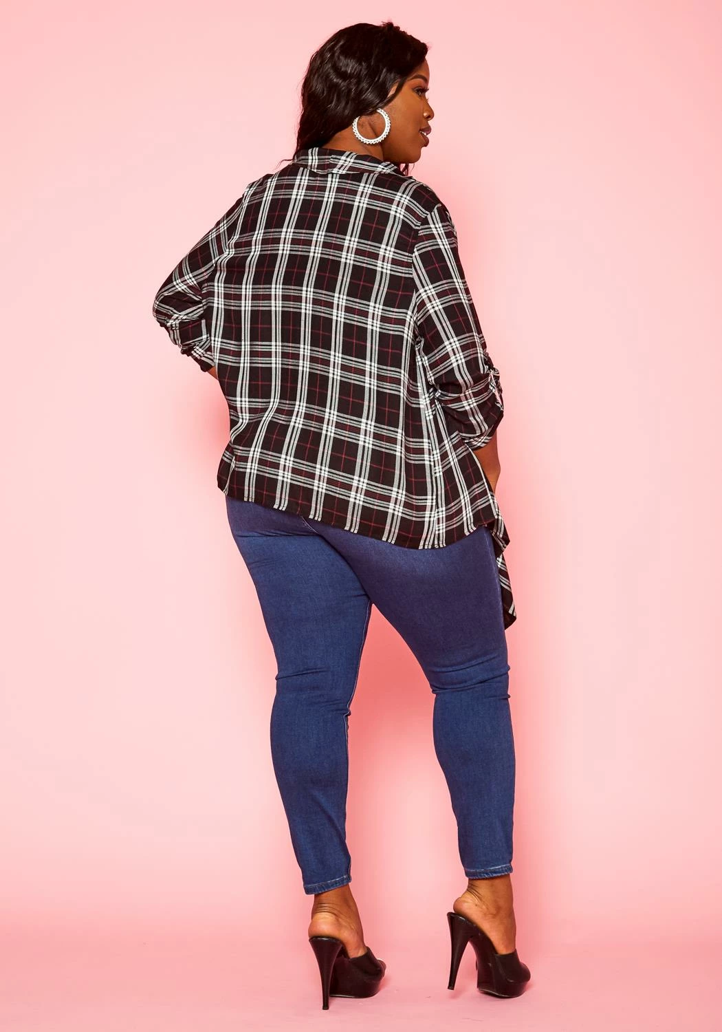 Casual plus size women’s plaid pattern cardigan with waterfall drape front design, open front style, 3/4 long sleeves and lightweight material.