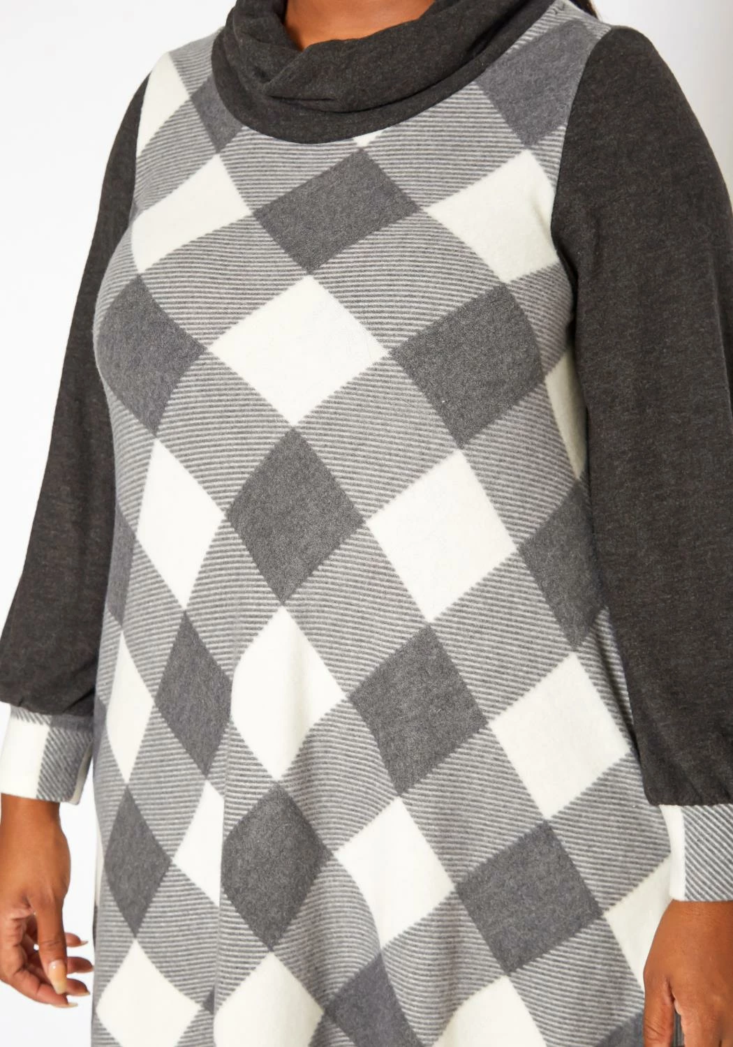 Chic plus size women’s plaid pattern mini dress in fit to flare design, funnel neck style, loose long sleeves, fitted wrist cuffs and pocket hem.
