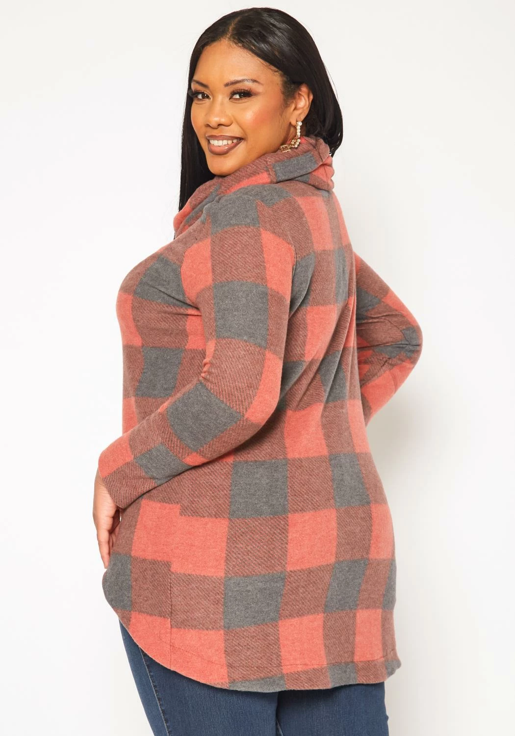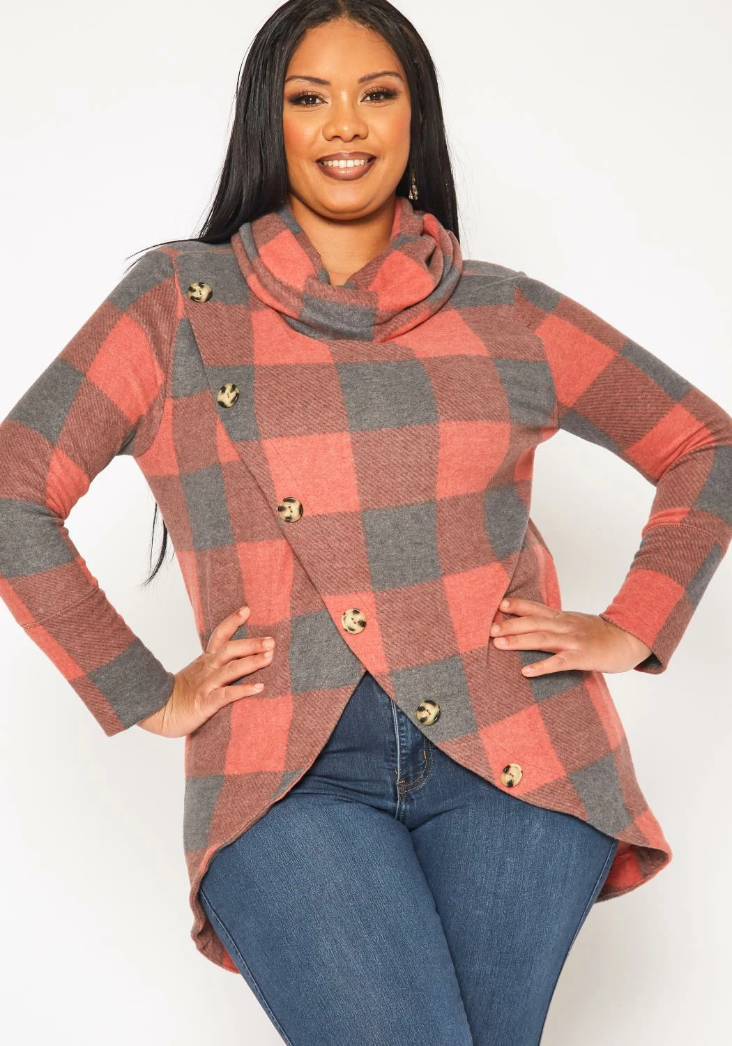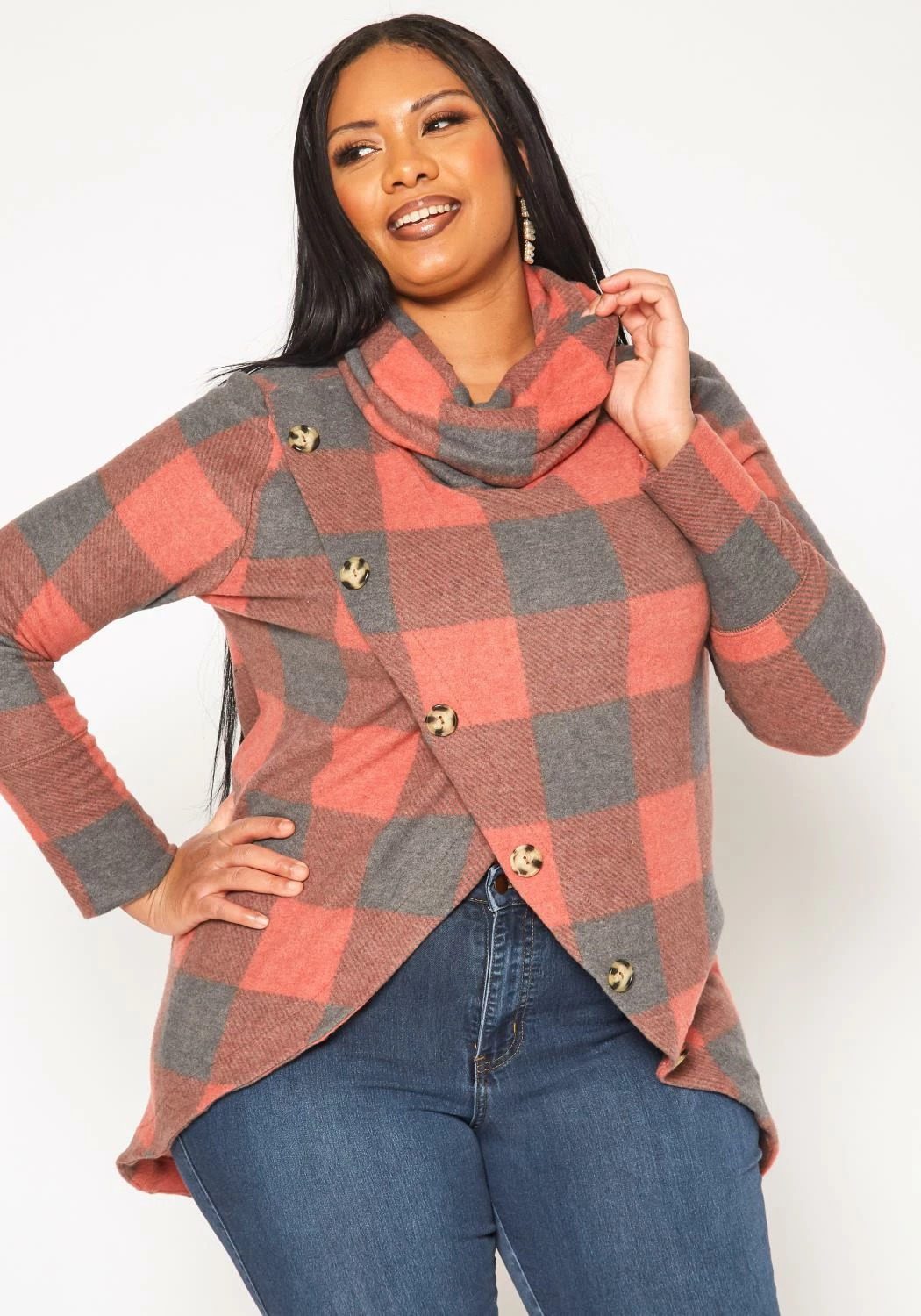 Chic plus size women’s sweater in plaid pattern, funnel-neck style, overlay design, button details and fitted long sleeves.