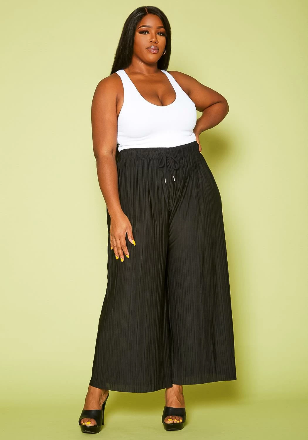 Plus size women’s pants in palazzo style featuring pleated detail, drawstring ascent & mid waist fit.