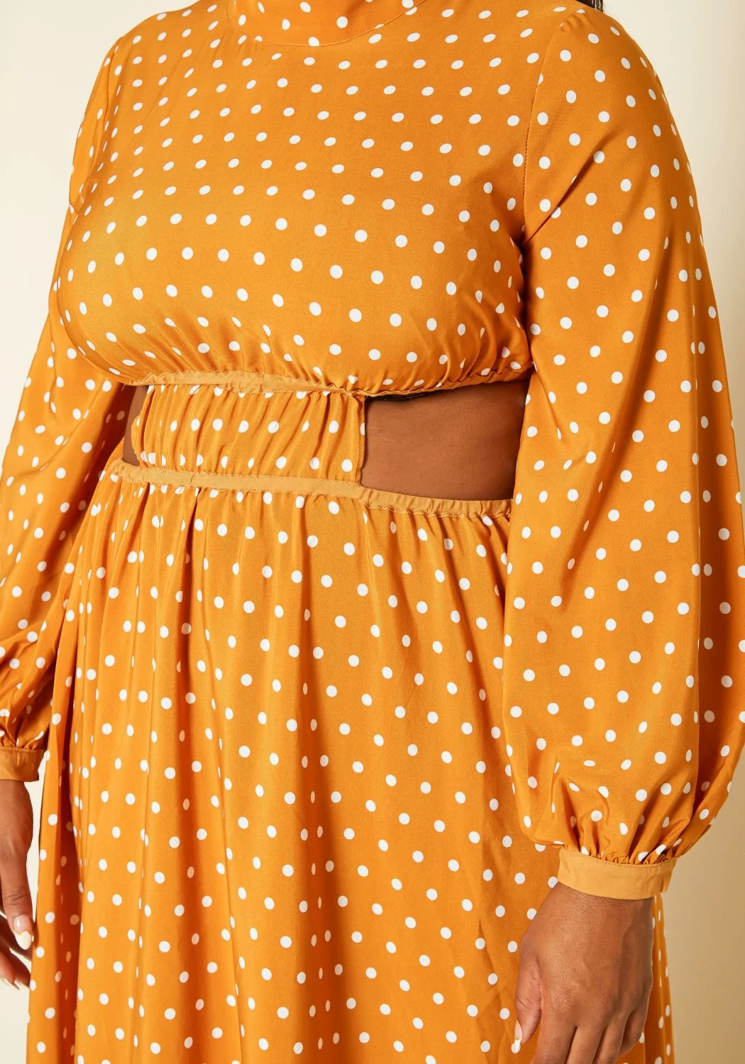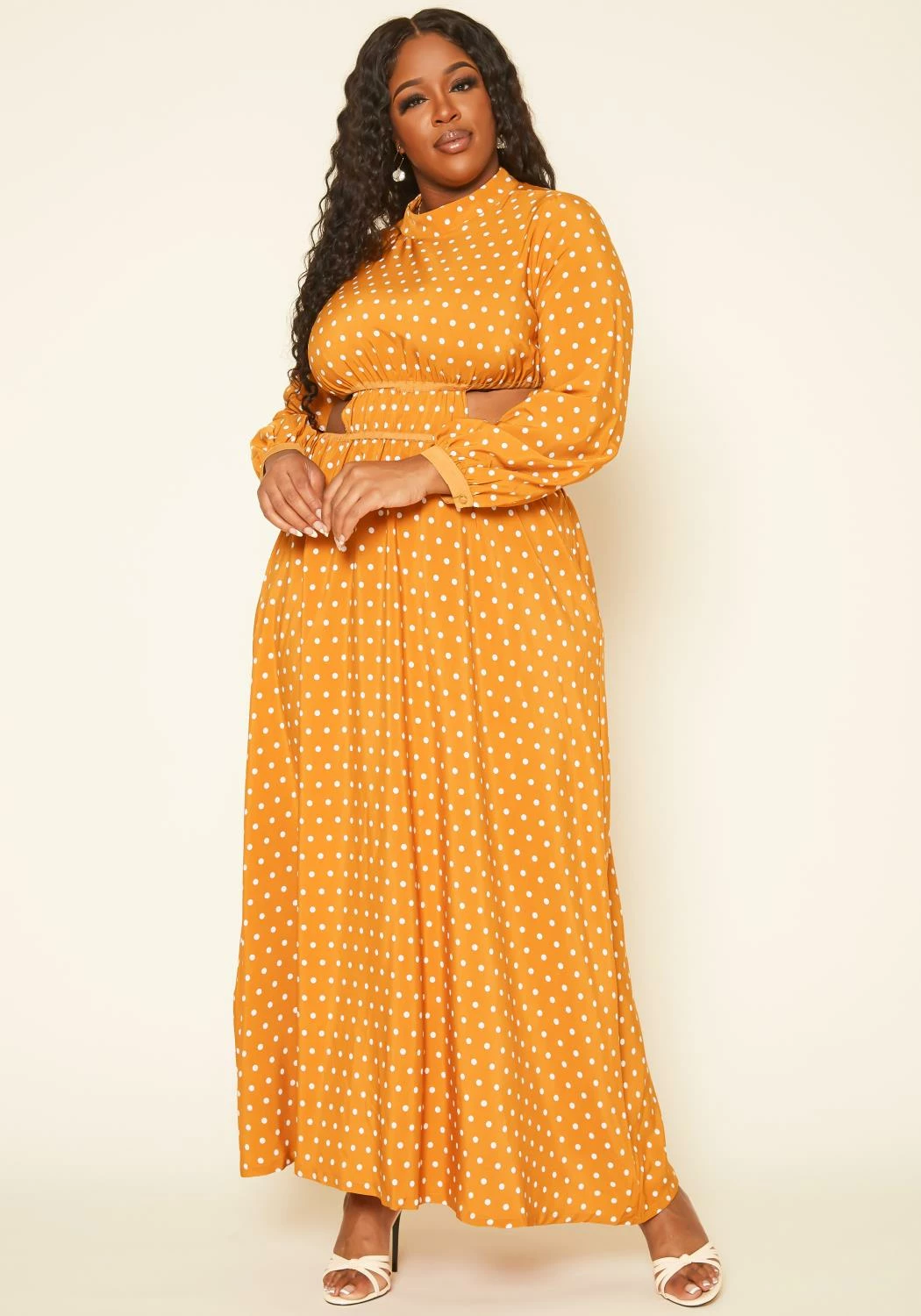 Chic plus size women’s maxi dress in polka dot pattern, mock neck style, long sleeves, cut out design and buttoned wrist cuffs.
