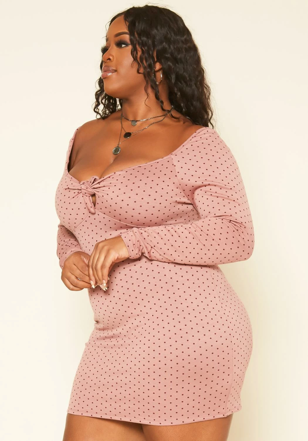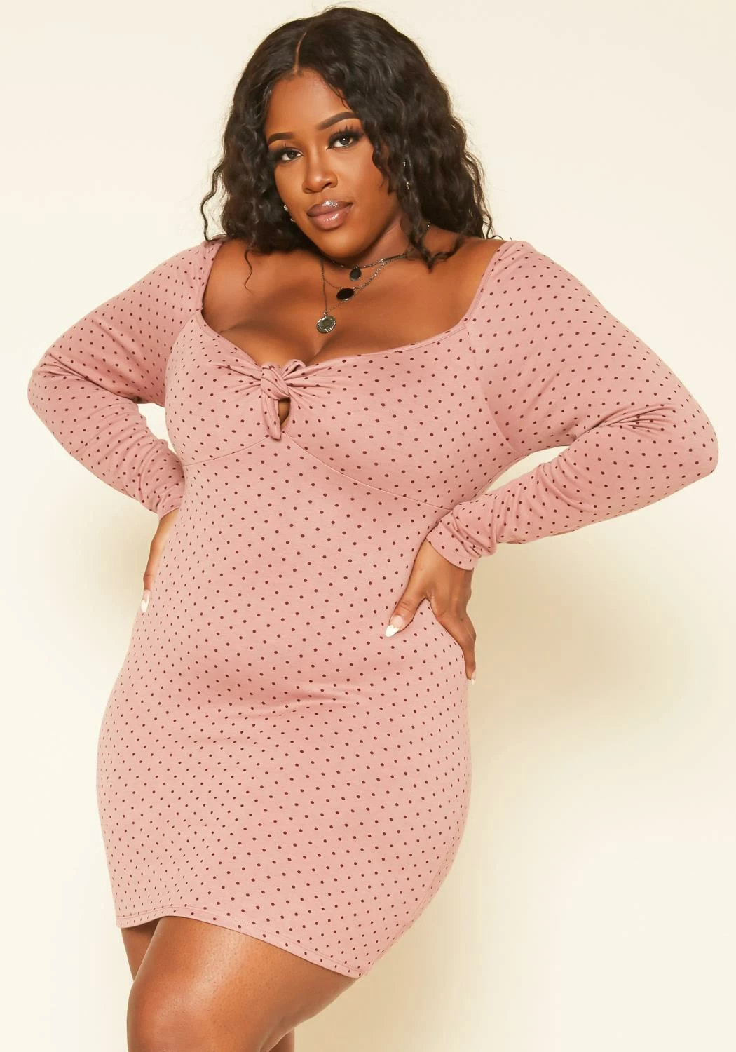 Lovely plus size women’s mini dress in polka dot pattern, sweetheart neckline, bow front detail, fitted long sleeves and bodycon fitting.