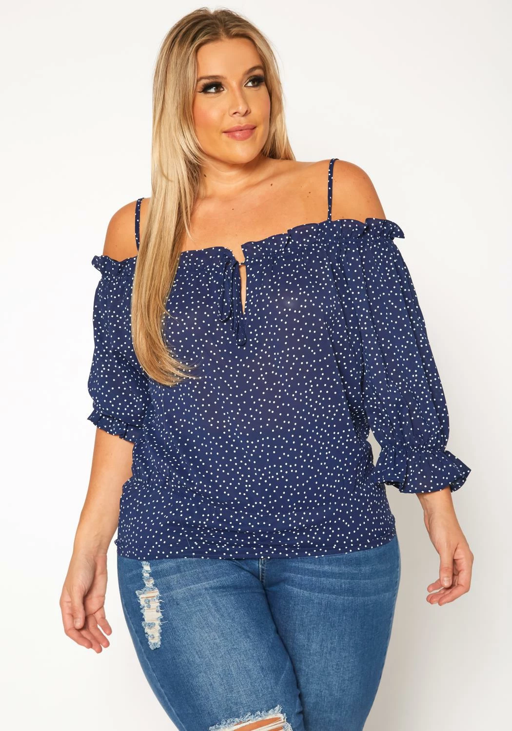 Lovely plus size women’s blouse in polka dot print, off shoulder style, cami shoulder straps, 3/4 long sleeves, ruffle trim details and tie front ascent.
